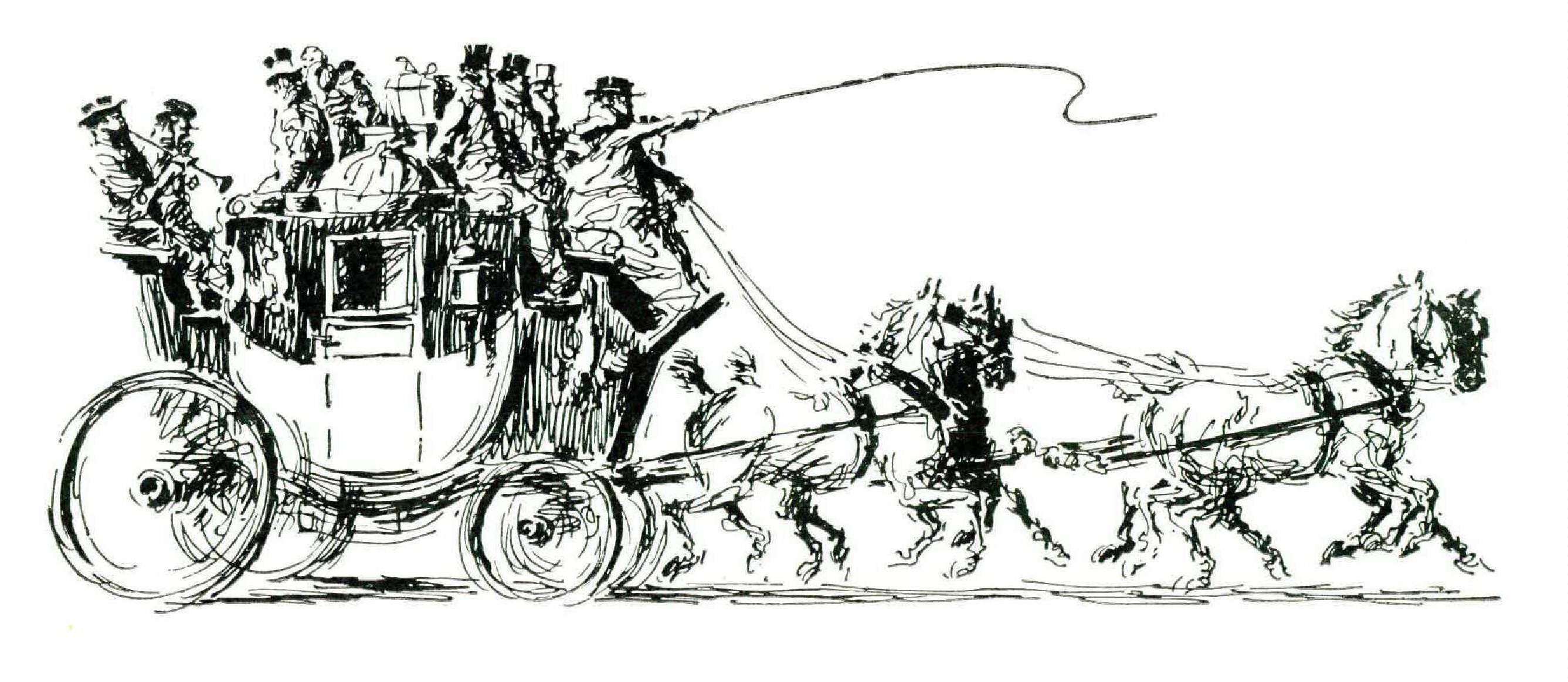 Dickens lived well into the Railway Age, but never took to it. (See Tony Weller’s wry remarks on the “rail” in Master Humphrey’s Clock.) He felt the immense chasm — no more and no less than the gap between the organic and the inorganic — that separates travel from transportation. But in 1832 his imagination was still happily anchored in the pre-paleotechnic period. As Mr. Pickwick remarks in his speech to the Club, “Traveling was in a troubled state, and the minds of coachmen were unsettled,” assuring us in this delightful sentence that travel was still far from its present state of dehumanization. The Road was all before the Pickwickians, where to choose their place of rest, and Providence their guide.