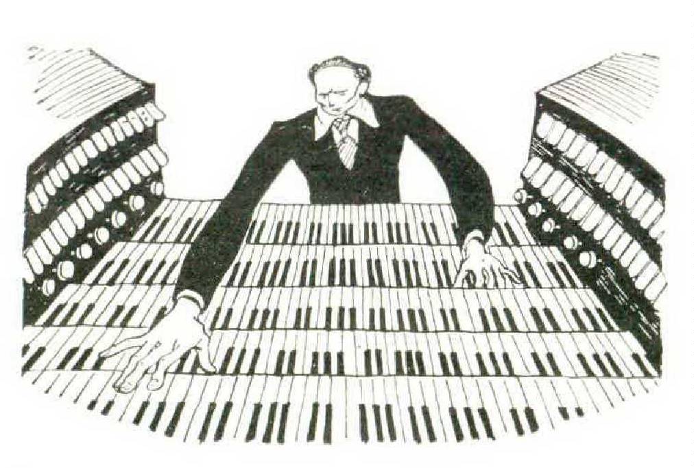 I sighed and sat down, as every organist sighs every time he sits down. I poked at the thumb pistons experimentally, then tried the generals down under. Number three was a fair fugal setup. I knocked off a mixture and a sixteen-foot and began spreading out the Wedge, the big E minor.