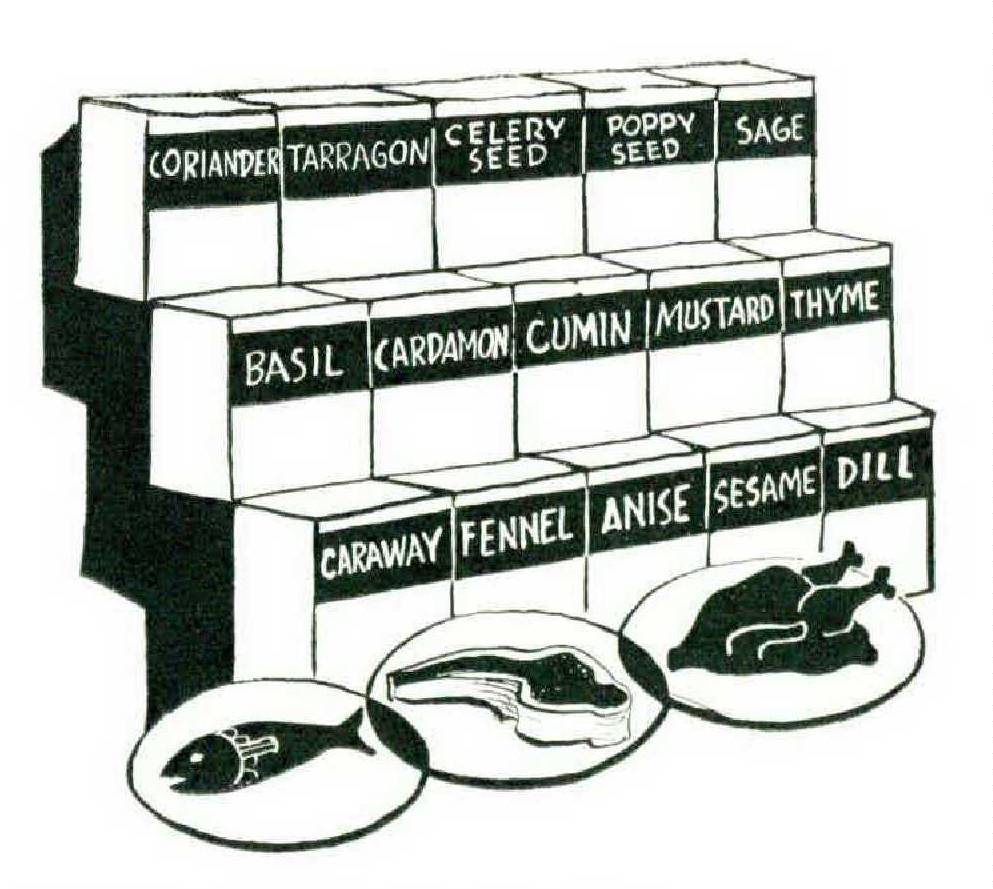 That Americans like “good plain food,” and that (hey are not at all interested in seasoning and spices, is accepted by many as a fact. Why, then, do we consume more spices per capita than any other people in the world? Why is it that “good plain food” found on many family and restaurant tables is so frequently augmented with bottled sauces and condiments that are poured over everything? Why is it that food processors find the description “. . and rare spices’ such a magic selling formula? Why is it that the hot dog, the very symbol of American taste, is sapid with exotic spices — including, incidentally, several savory seeds: dill, coriander, sometimes cardamon and cumin? Of course we like seasonings, and we know them intimately by taste, if not by name.