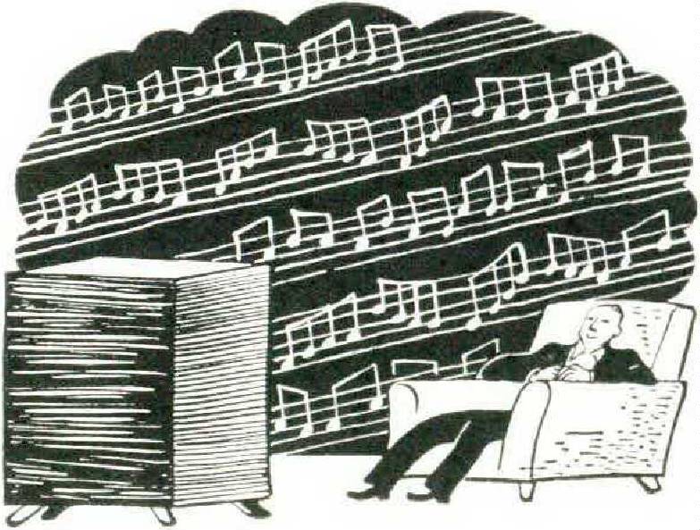 Such a rig’s components would be designed to handle, without appreciable distortion, all the tones the human ear can take in — sound frequencies from about 50 cycles per second at the bass end, to about 15,000 cycles at the treble end. For comparison, one of the most popular commercial long-playing record attachments delivers no treble above 4000 cycles. Many a popular console radio-TV set cuts off at 5000 c.p.s. A table radio may handle only the range between 300 and 4000 c.p.s., hardly one quarter of the tone range the ear gets in a concert hall.