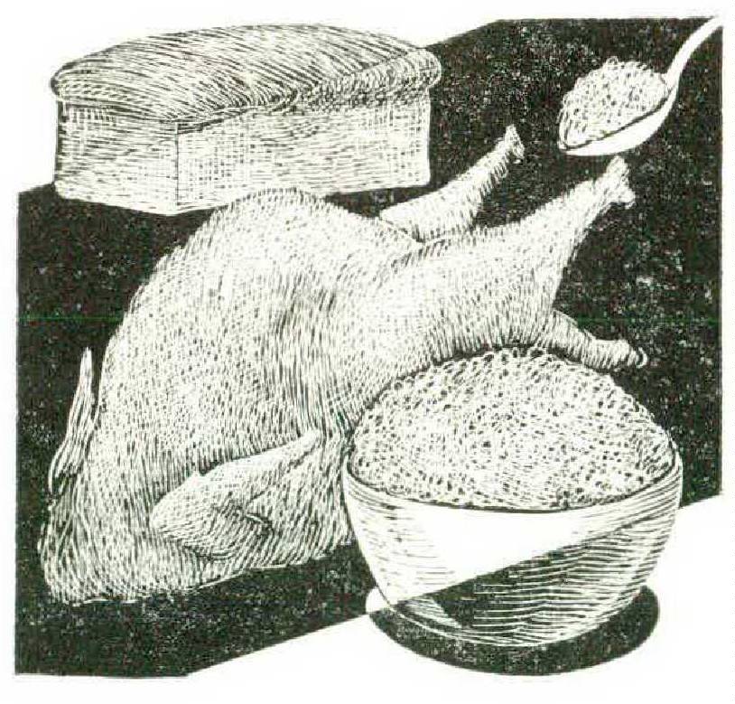 In my mother’s kitchen every speck of lung or liver was removed from the inside of the turkey anti clear, cold water run through it in a brisk stream. Then the inside was well dried, so that no lingering bits of inedible or off-taste matter could remain. As for the outside, two of us have spent as much as three hours on one turkey, seeing that every pinfeather was removed and every bit of yellowed dead skin peeled off, so that those who thought the crisp, golden crackling skin the best part of all would really have something to talk about.