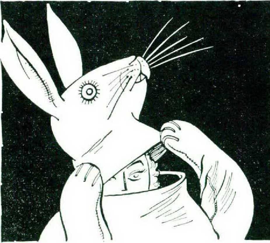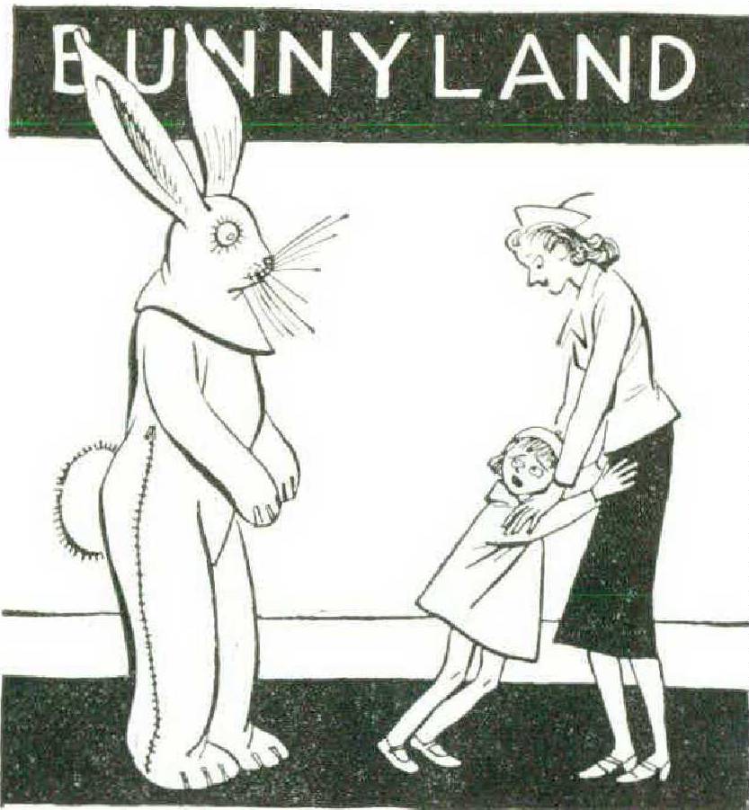 But two days before the publicized “arrival” of the Easter Bunny, promotion department faces grew taut, employees began shouting at each other, and there was general tension in the air. I learned the reason — my long-eared head had not reached the store yet! Word traveled fast, and each face mirrored the increasing anxiety. Every day for a week one bigwig had greeted the other in the morning with a low “ Has the bunny’s head arrived yet ? until, with two days to go, only a desperate “Well?” was necessary. Indeed, not only the promotion department but the whole store was in an uproar over the mishap, and there was nothing but bunny-talk, until one long-employed woman, harassed to tears, zoomed away in an elevator with an irate “Bunny, bunny, bunny, I’m sick of this bunny business!”