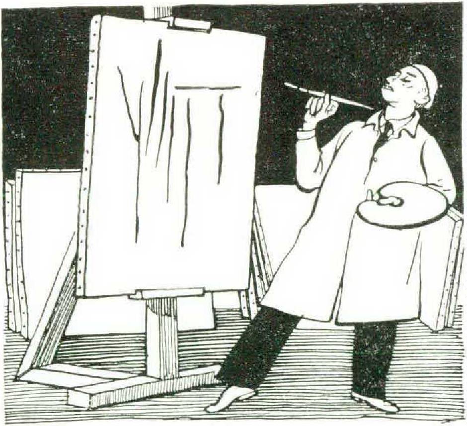 “Unfinished Symphony.” A still life (still incomplete) showing the lower half of an apple. Painting the apple made the artist hungry, so he laid down his palette on the liv ingroom sofa and went out to the kitchen to make himself a sandwich. Meanwhile the artist’s wife, wearing a chartreuse housecoat, entered the living room and sat down on the wet palette. Naturally some of the color pigments adhered to her housecoat, creating a baroque, rainbow effect as well as a big row when the artist returned with his sandwich. “Unfinished Symphony” is the artist’s final work. It is a little damaged from being thrown hard, but it is still a great buy because with it go all the artist’s brushes, a pint of linseed oil, palette, easel, palette knife, and his tubes — which are “twisted and dried,” as Kipling once said.