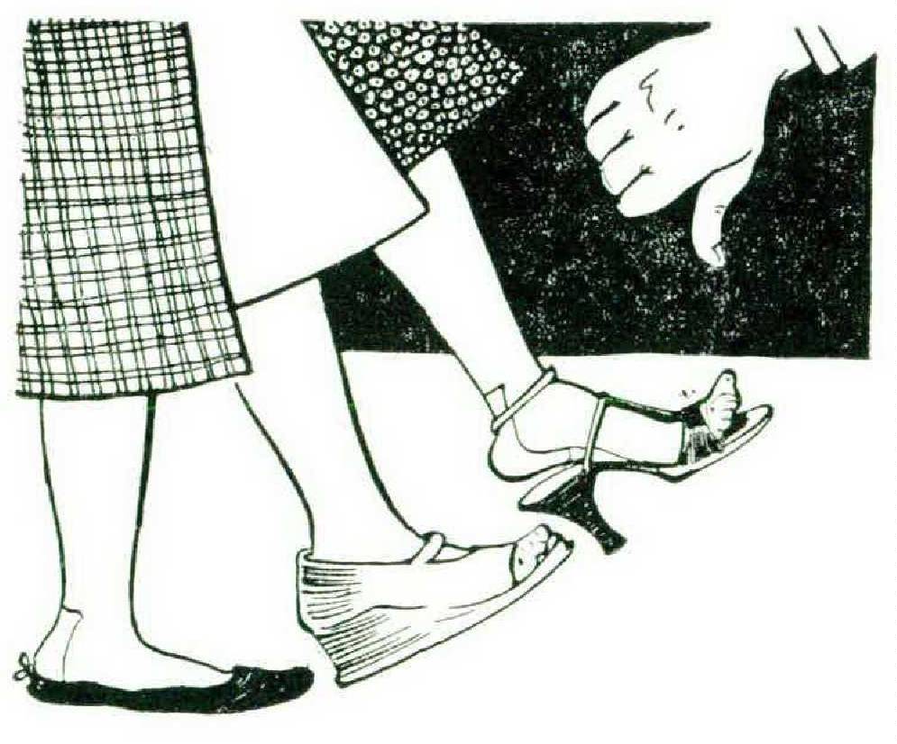 The second model was the wedgie. The designer of the wedgie discarded ihe notion that a woman’s foot could be dainty and her ankle trim; he thought it more natural that they should clump about as if they had been born with hooves. All the graceful part of the shoe was filled in solid. You get the same effect if you root around in the hall closet and find some worn-o.ut rubbers, lash these in a black mass to the rear of an old shoe, and what have you; Well, you haic a heavy, awkward stilted object which looks as if the wearer needed crutches. To get along, that is.