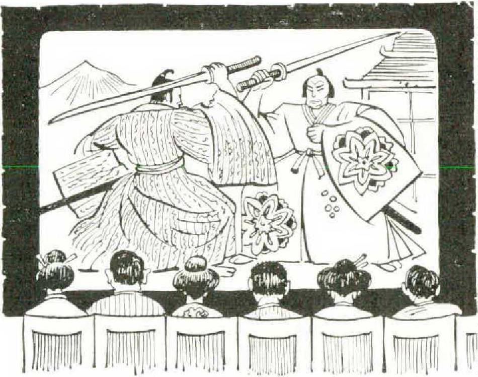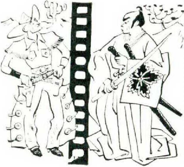 I was aware that a certain minority of the foreign colony in Japan sat (when they had the rare luck of locating seats) through Japanese films occasionally as a cultural duty or in pursuit of the language. But these shows I write of will never impress Venice the way Rashomon did; nor is it likely that auditing one would avail the student of Japanese as much as would five minutes with a good grammar, unless he had uses for the unlovely monosyllables supposedly uttered by members of high society in feudal Japan upon taking a blade in the giblets. No, these are simpleminded exercises in violence, and they can be enjoyed by anyone, regardless of ear for the language.