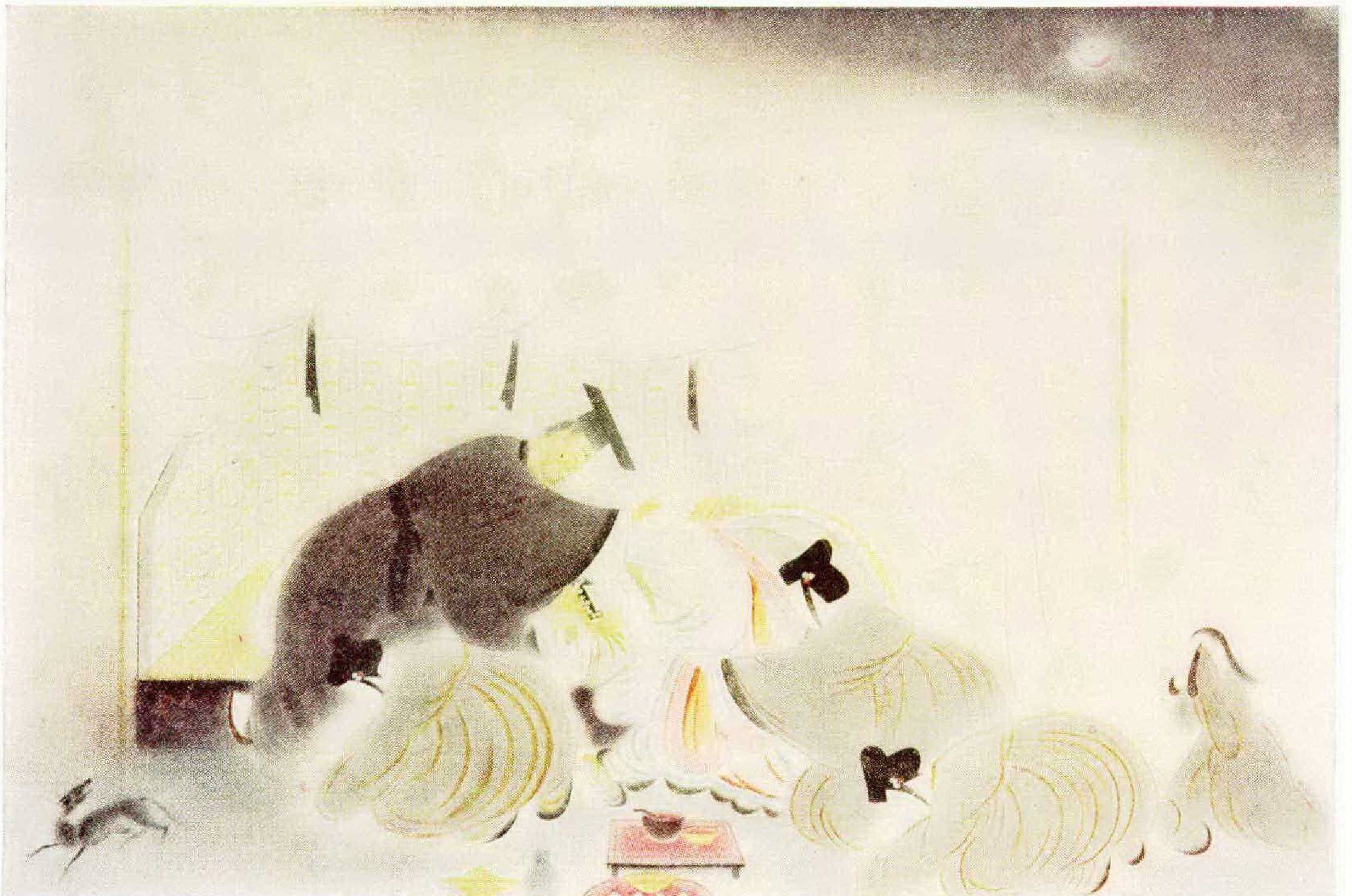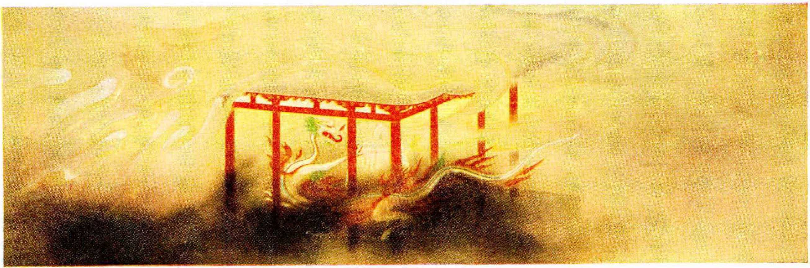 OF THE paintings reproduced in our collection perhaps the one which most plainly shows the vitality of the classical tradition is the section of Kokei Kobayashi’s scroll The Tale of Dojoji (Plate 1) which tells again the old legend of a young Buddhist novice who took refuge in the Dojoji monastery to escape a lady who had fallen in love with him. She changed herself into a dragon and the novice hid under a great bronze bell. The dragon-lady could not get him out but her passion was so burning that it melted the bell and with it the unfortunate novice. In the final scene of the scroll the artist has painted cherry trees blooming peacefully many years after the flames of passion have consumed themselves.