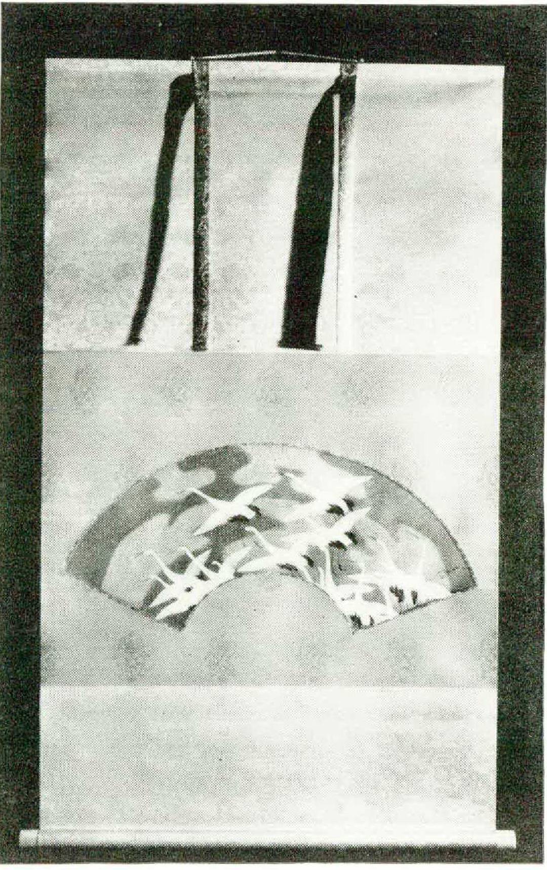 A second painting by Kobayashi, Cranes (Plate 4), illustrates another of the characteristic physical forms of traditional Japanese art — the Kakemono, an oblong silk hanging shaped to fit in the tokonoma niche of the living room. The present Kakemono form was brought to Japan from China about the 13th century and little is known about the original function of the two cloth strips which hang from the top of it, but they are still retained, their placement being a calculated part of the proportion of the whole mounting. Classic Kakemono paintings were usually vertical but here the artist has used the horizontal shape of a folding fan which has an auspicious meaning in Japan. Kobayashi did this picture for a friend’s anniversary — the white cranes signify long life. The clouds are done in platinum dust sprinkled over a gold background.