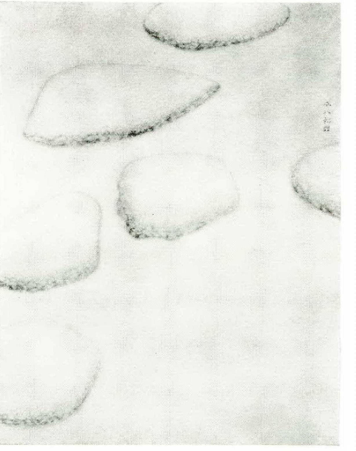 Another contemporary artist who has successfully linked the old and the new is Heihachiro Fukuda, a painter now in his early sixties. His First Snowfall (Plate 5) is a good example of what Dr. Yamada means by “the world apprehended intuitively.” In this simple picture of steppingstones in a garden thinly covered with snow, Fukuda is trying to present the intrinsic beauty revealed in a small section of nature in an abstract form which is in itself beautiful and at the same time symbolic. By the most severe elimination of what is not essential — and we can imagine how many sketches must have preceded the final selection of shapes and placement of the stones in relation to each other — he has expressed a whole complex of emotion. In the same way a Japanese poet uses the austere, highly disciplined Haiku form of only 17 syllables to convey themes rich in implications of profound meaning.