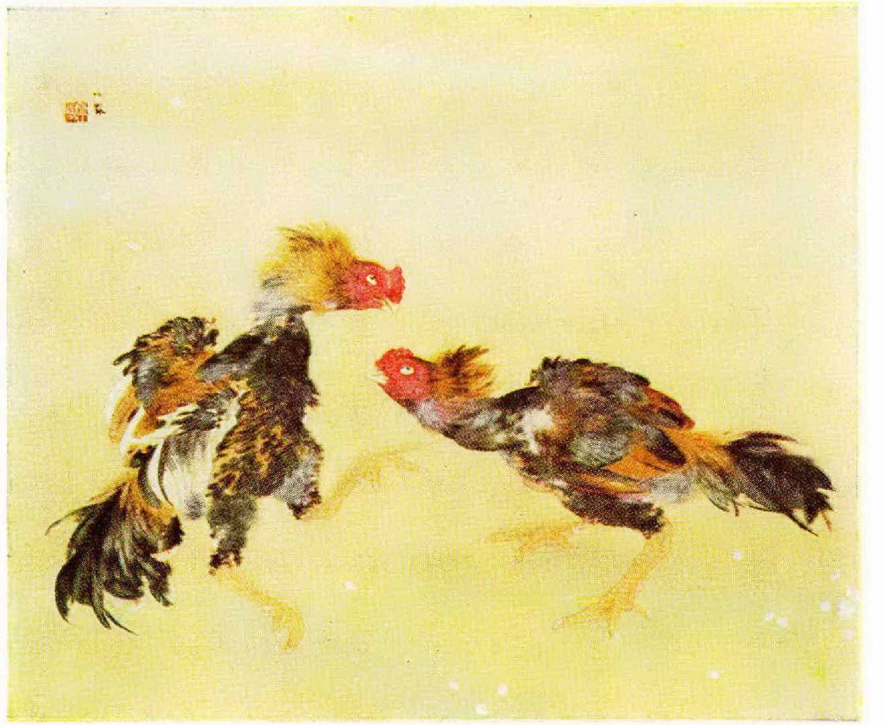 In the Edo Period an element of realism was brought into Japanese painting by the 18th century Maruyama school, perhaps in response to the taste of the rich mercantile class which, as it rose to power, began to patronize the arts. The wonderfully colored Fighting Cocks (Plate 11) of Seiho Takeuchi (1864-1942) are in this tradition. And they are typical of the countless pictures of animals, birds, and fishes which one sees everywhere in Japan. The Japanese are deeply fascinated by such living forms. In bad art they become sentimentalized — one sees many “cute” little kittens done in a sugary, though always delicate, style — but at their best, as with Takeuchi, they are as strong as European still-life painting, with subtleties of composition which give them the power of abstraction.