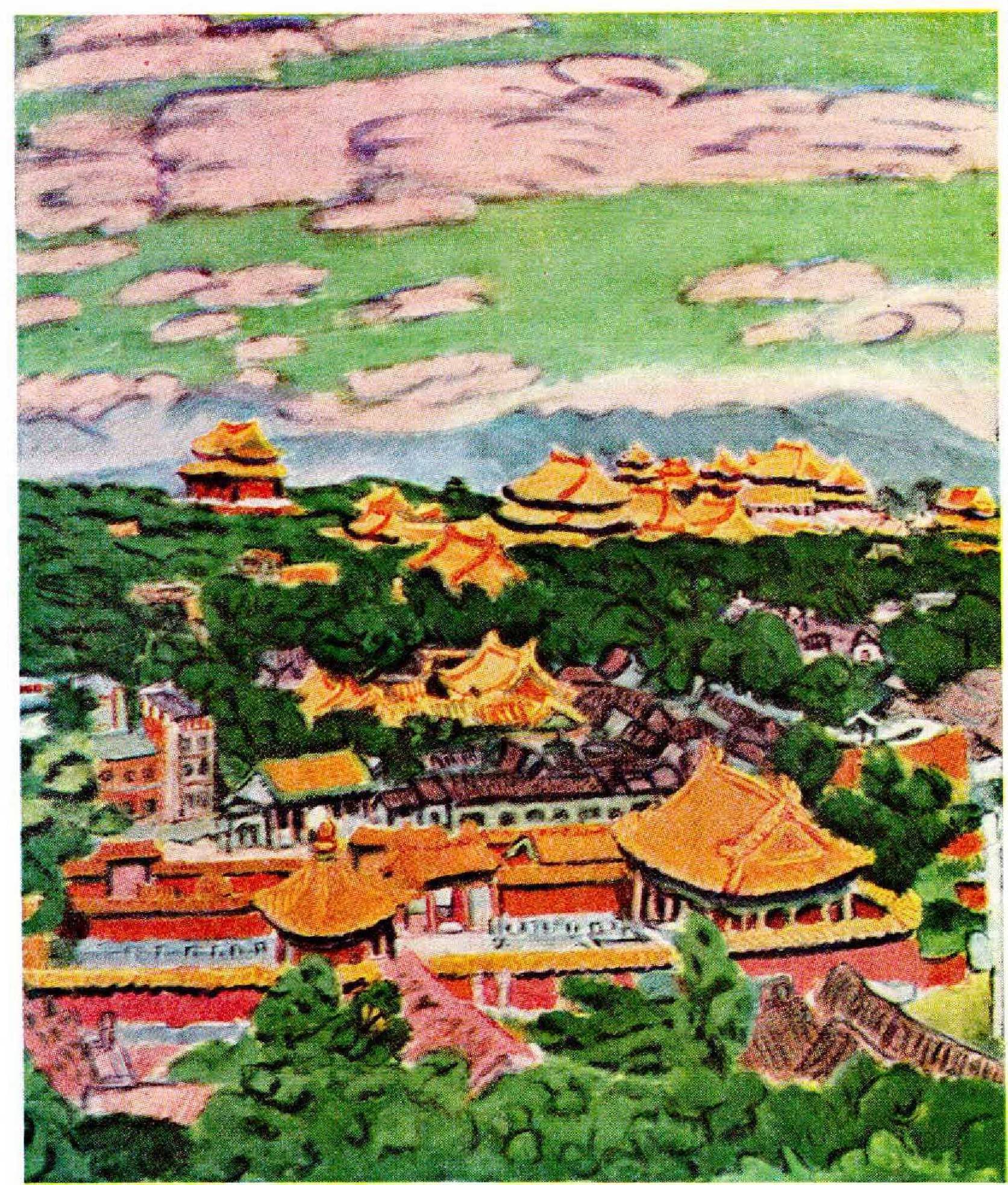 WE TURN now from pictures done in “Japanese style” with ink and water color to those in “ Western style”, or oils. In the wave of Western influence which swept Japan in the Meiji and Taisho Periods art forms were absorbed along with technology and it is safe to say that today two thirds of the professional painters in Japan are working in oil. Their various styles are similar to those found in Europe and the United States, ranging from naturalistic realism to non-objective abstraction. Among the most interesting are those who seek to use European technique in a Japanese way. Ryuzaburo Umehara’s Palace in Peking (Plate 12) is such an attempt. Umehara, born in 1888, studied with Renoir in France and was later influenced by Matisse, before perfecting his own style.