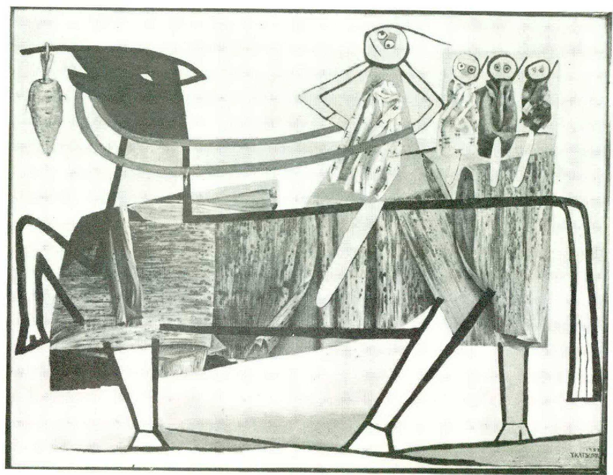 Among the younger painters, Miss Yukiko Katsura applies a surrealist, approach to purely Japanese motifs in a cartoon-like style that is most effective for satire. In “Giddap!” (Plate 14), which uses bamboo leaf and textile motifs, her politicians might well be urging the Japanese donkey to pursue the carrot of the American dollar.