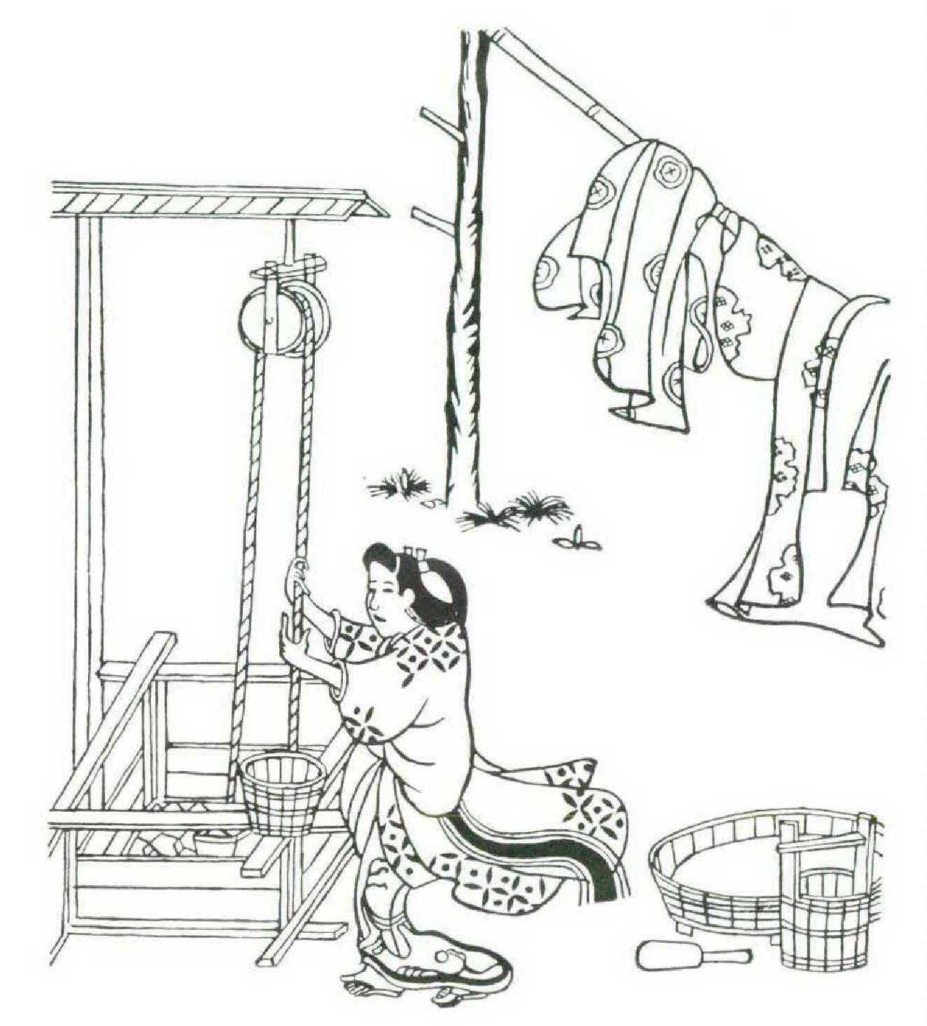 But they had made their flight without any preparation, and, finding no way to make a livelihood, they pawned the small sword which she had carried, and lived awhile on the proceeds therefrom. But soon there was no money left. So every night the man would go out selling medicines, but with little profit. At last, there being no other alternative, the girl began to take in laundry — work to which she was so little accustomed that it was pitiful to see. Indeed, the people in the neighborhood began to think that there was something strange about these two.