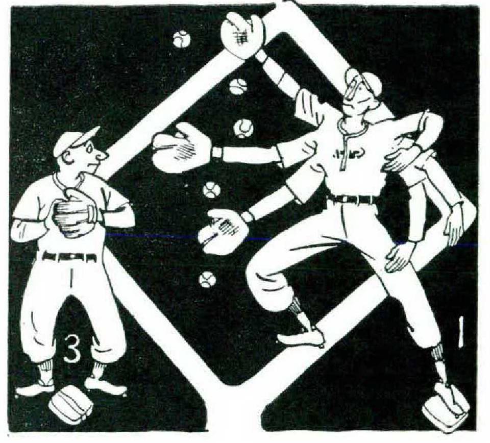 A box score, taken at random, of the New York Giants-St. Louis Cardinals eleven-inning game of July 17 last year shows that first baseman L’ckman (Lockman) of the Giants had thirteen pul-outs, one assist. First baseman C’ngham (Cunningham) of the Cardinals had fifteen put-outs, two assists. Besides all this defensive play, the fortunate customers on the first base side had a close view of fifteen of their heroes getting on base by hits, seven by walks, and one by error. For whatever pleasure or pain it gave them, they also saw fourteen Giants safe on hits, two by errors, and one hit by pitched ball. This adds up to around seventy separate bursts of action a that corner.