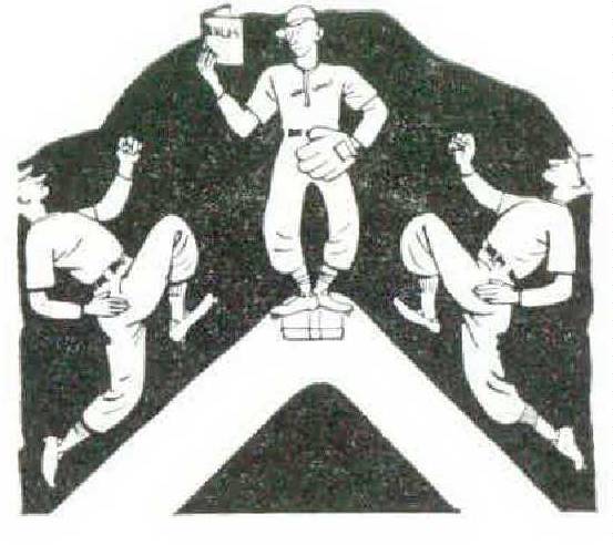 ’This was only the beginning, being followed 1) by attempts of the base runner, in coöperation with the hitter behind him, the first base coach, and the manager in the dugout, to take second by stealing, the hit and run, and the sacrifice bunt; and 2) by the teamwork of first baseman, pitcher, and catcher to hold him close.
