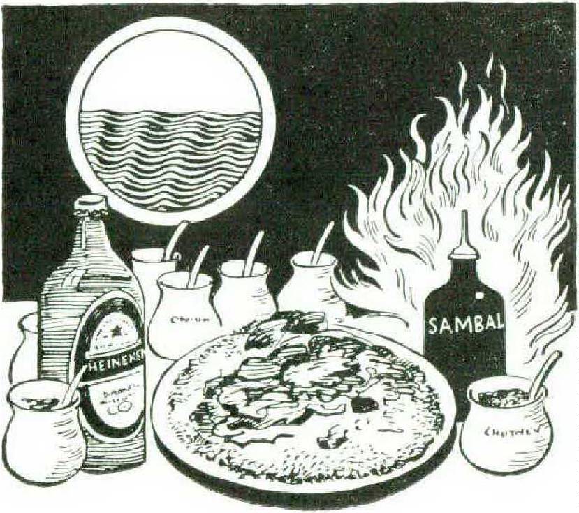 Britishers abroad feel about it much as they do about anything even vaguely curried, which a Nassi Goreng is not, and they bandy reminiscences larded with pukka and boy. Reticent, withered Dutch ladies, relicts of traders in Surabaya in the old days, grow almost gay again and chat of Rystaffels, which a Nassi Goreng is not quite. And everybody cats too much and sleeps all afternoon, for the feast is not only tantalizing to several of the senses, but it must be floated down on a heady flood of beer.