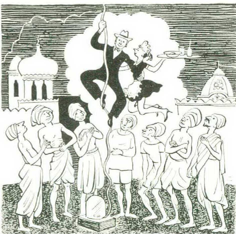 The American produces a standard roll of ticker tape which he places upon the ground. By chanting stock quotations he makes the ticker tape rise vertically into the air to the height of two Cadillacs stood on end. He then seizes an American car-hop waitress whom he has brought along for the purpose and shinnies up the ticker tape, dragging the girl up by her voluminous blonde hair. The two disappear into nothingness at the top of the tape. Very soon the sounds of a titanic struggle are heard, and pieces of debris fall out of the sky in a manner reminiscent of New Year’s Eve in New York City.