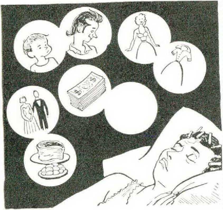 I recommend thinking up Mystery Titles too. One day, as I stared at a drugstore pocket-book display, it occurred to me that the way mystery writers get their titles is simply to take any common phrase and ugly it up. This turned into a fine going-tosleep game. A Corpse of Another Color. Three {Winding) Sheets to the Wind. Two’s Company, Three’s a Shroud. Murder Machree, a fine old Celtic tale full of peat bogs and Irish whiskey. This mystery title game works in a devious way. When one of them strikes you as funny (it is remarkable what can strike you as funny at three o’clock in the morning) you can always nudge your husband awake and tell it to him. Then, for some reason, you always go promptly back to sleep while he takes the conn.