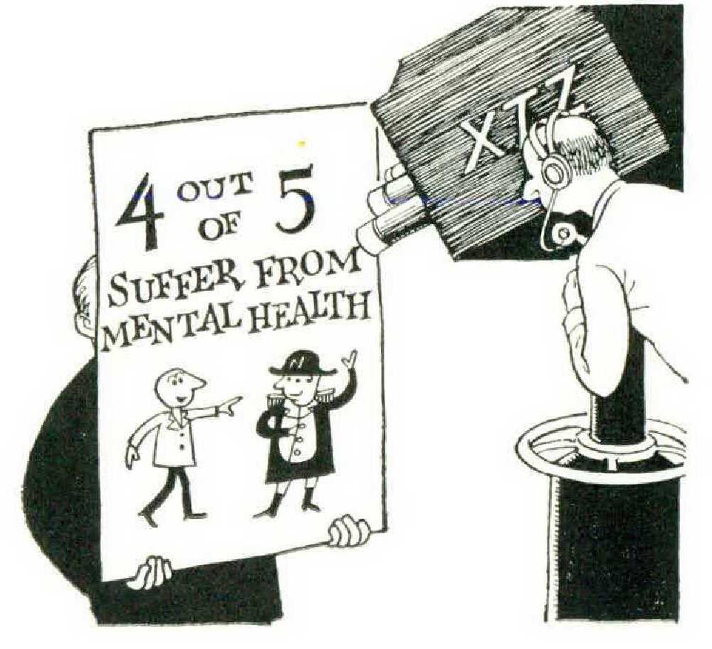 TV ANNOUNCER (pointing at a blackboard chart that proves conclusively that MH is on the rise). Mental Health can strike you or your loved ones at any time. Thousands suffer needlessly from this condition. Don’t let it happen in your community. Send in your dollars and dimes today and join the fight against MH!