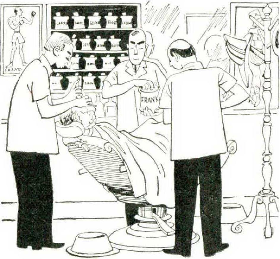 My barber, Joseph, buys a Veteran’s Poppy every year and twists its stem around the railing on his glass cabinet. During the next twelve months it wilts considerably but is replaced by a new one every year. On the mirror is a peeling decalcomania (by courtesy of Lucky Tiger) of three rigid feminine profiles depicting the bob, the shingle, and a tortured spit-curl effect. This is a reminder of that nervous period when the flappers threatened to take over the barbershops. Well, have they? There may be a former flapper sitting over there, but she has brought in her youngest for a whiffle. Nothing has changed but the prices.