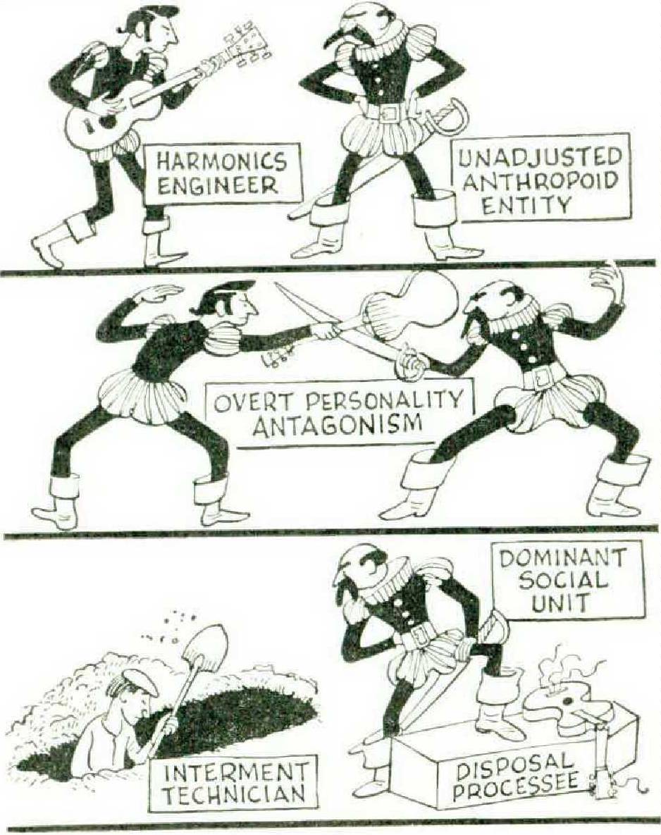 Ethelred is recognized and channeled to the Cooperation Procurement Division, where the Personnel Processor prepares him for Applied Antitherapy. In the meantime, disguised as a Reader Adviser, Rowena enters the Intrusion Prevention Structure. She frees Ethelred with a minimum of expenditure of the timeloss factor, but then the duke’s henchmen grab them and Monstro watches gloatingly while his Personnel Processor broils both of them to a crisp over a nice lire and . . .