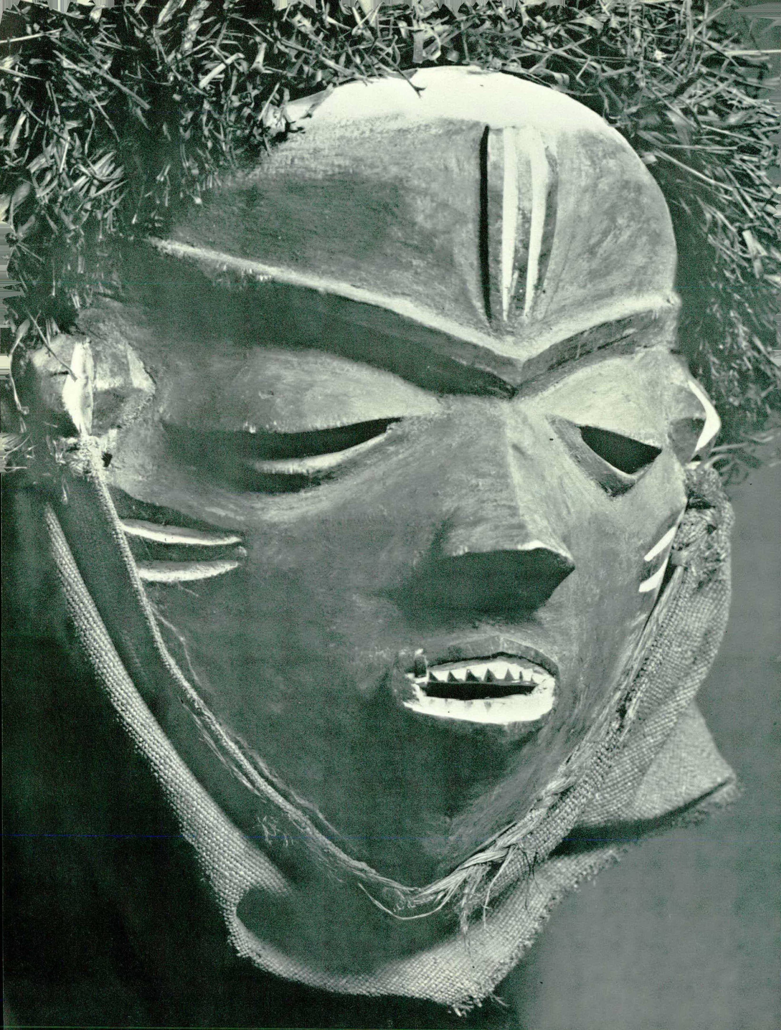 These masks are worn mainly for two types of function: puberty rites and secret societies. The coming of age of a boy is the most important thing in his life. Even to this day some tribes maintain this ritual. I was fortunate enough once to see part of such a ceremony in the Belgian Congo, when I came across a clearing in the jungle where the young boys of the village had been taken away from their parents for several months to undergo the coming of manhood with their teachers. Here the boys had been circumcised and then taught the folklore of their tribe. I was able to see twenty boys dancing in a snakelike line under the rigid tutelage of a weirdly masked teacher carrying a small whip, before I was invited to leave.