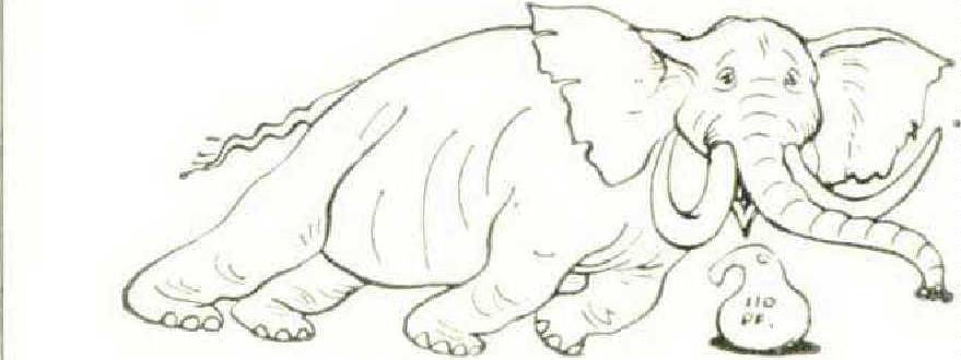 Bull elephants have a fondness for the sap of the lala palm, which provides native villages with a seasonal liquor supply. Toward the end of the rainless months these palms are trimmed down to stumps, a circular groove is cut below the top, and a leaf is inserted to act as a spout, which drains into a hanging calabash. Shortly after, a sweetish, tangy fluid begins to flow, which makes an invigorating drink when fresh, but when fermented is said to have the kick of a giraffe. During this season old bulls regularly make the rounds of native villages, toss off the contents of all available calabashes, and then go crashing through the bush squealing and trumpeting boisterously. Native calendars appropriately call his the “ho.-ho month.”
