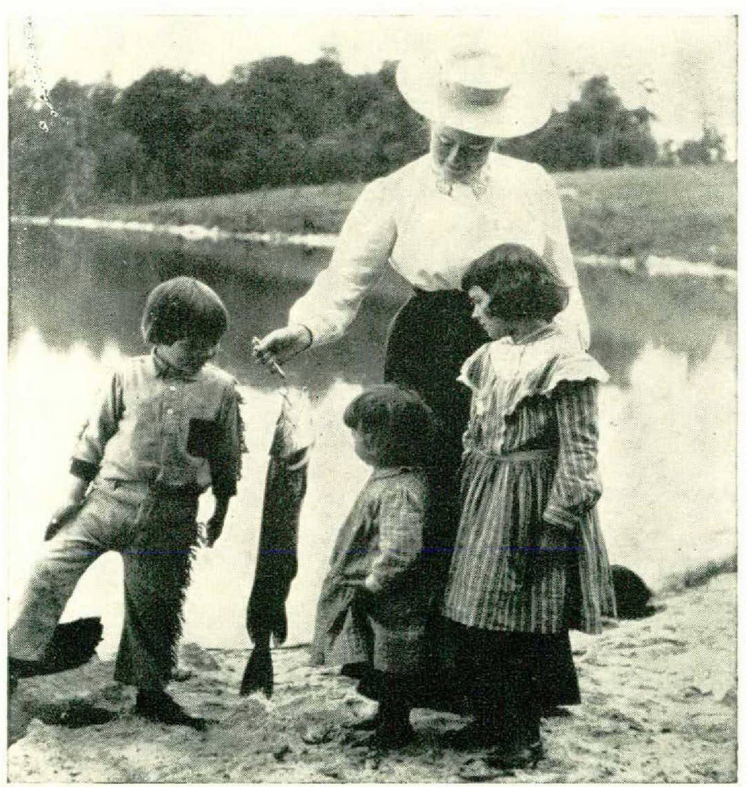 About 1907, Daddy and Uncle Tyley went to Brevoort Lake in the Upper Peninsula, where the muskellunge fishing was said to be really sporting. An old guide at whose cabin they stayed outfitted the party. Daddy brought home three hundred pounds of fish caught in three days! The muskellunge and pike were gigantic to my eyes. Daddy was busy all the first day back, giving away fish to the neighbors. He kept our supply in the wooden icebox under the trees, and for the next week we ate fish baked and broiled and fried. The pike was especially good baked with bread stuffing flavored with sage and onion, and the stories Daddy told of his adventures in acquiring his catch added to the zest of our fish dinners.