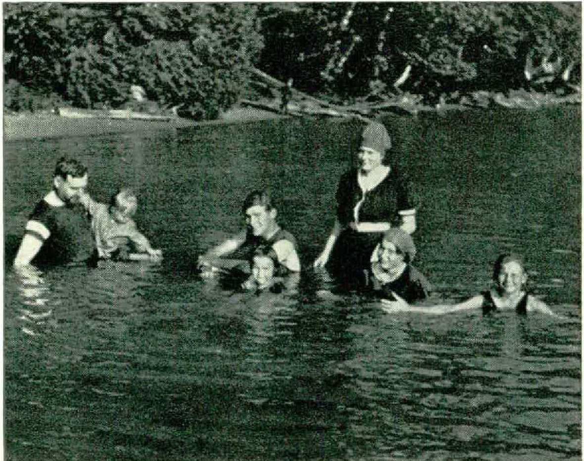 Mother, having fair skin, never tanned; she only freckled and blistered. My dark-haired, bearded young father loved the sun and tanned to mahogany. Mother liked to swim, but she hated to touch her feet to the bottom for fear that she would hit something “slimy.” Actually, there wasn’t anything to touch but some sticks or a sunken log. Mother would swim out to Dad, who would station himself, treading water, in deep water well over his head. Mother would rest on his shoulder for a moment, then turn and swim back. That way her feet never touched bottom until she could see the good hard sand in the clear water near shore.