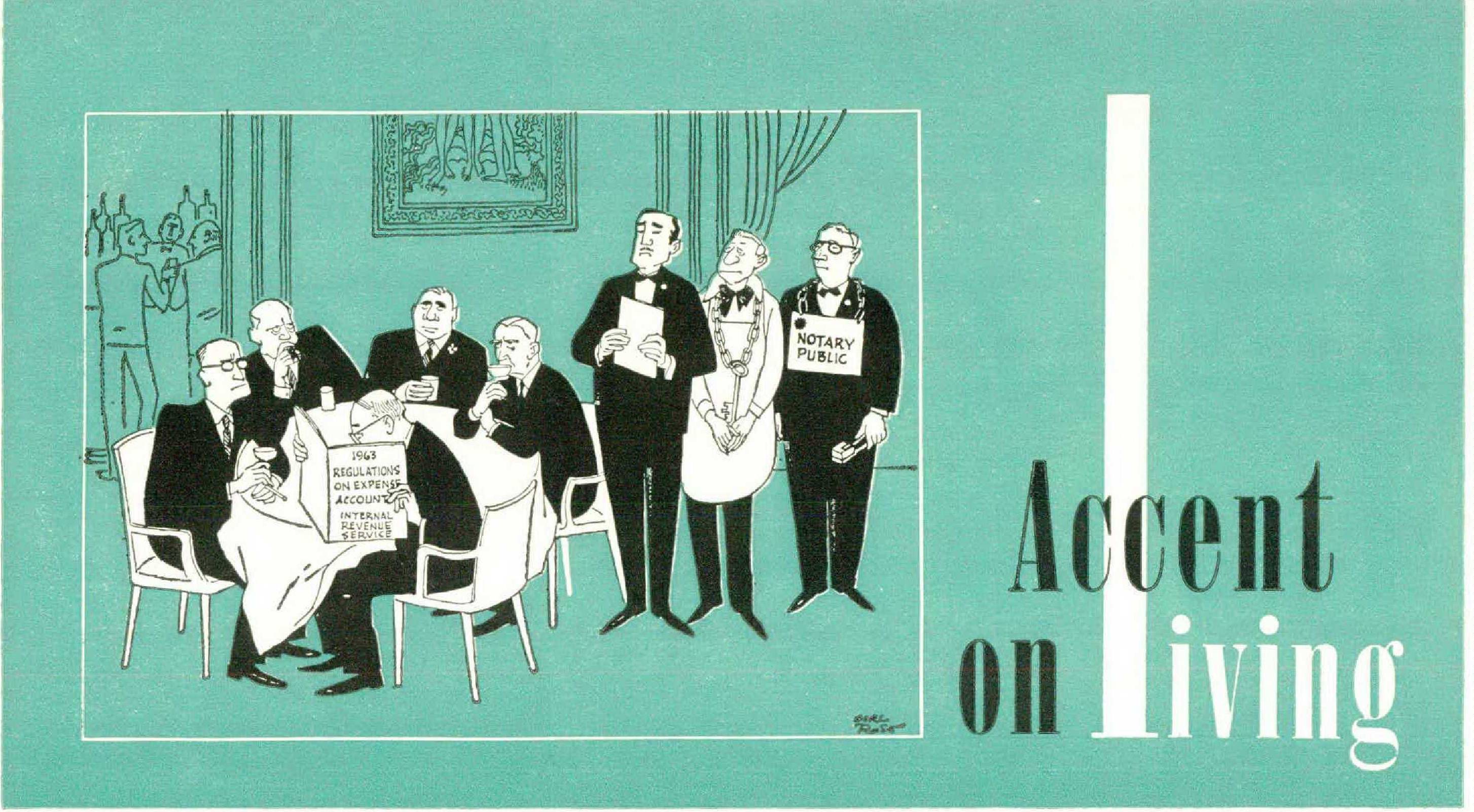 On this occasion, J. Ashley Spratt and his sales manager, of Goliath Steel, are playing host to the president and the production chief of Majestic Tack and Pushpin. They are joined, as they sit down, by a fifth man who had been waiting at the bar. Spratt introduces him. “Let me present Goliath’s auditor, George Stronk,” says Spratt. “He’s just going to see that everything is OK in terms of the new Treasury regulations on expense accounts. I understand that the drinks are part of the meal if we have them here at the table, so I’ll begin with two double fireballs on the rocks. Order up, gentlemen.”