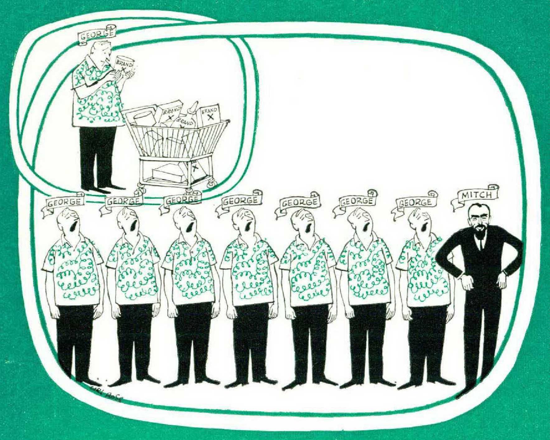 George, in short, is the husbandchump image so stoutly believed in by the advertising agency and its Client: any housewife seeing George in the commercial will buy The Product just to show George who’s boss. It’s a handy name too, quite without embarrassing overtones of race, religion, or nationality. At this writing George is obsessed by the subject of toilet paper.