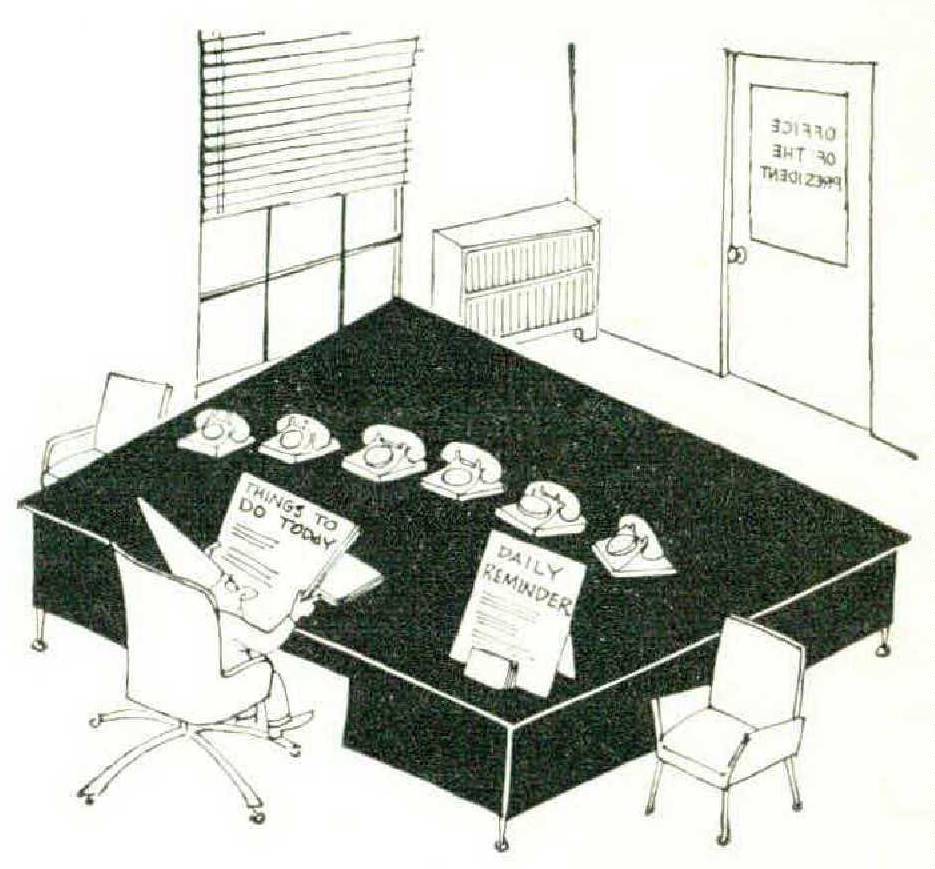 The remarkable thing about these gadgets is that just about every one of them appears to be based on the premise that our average big-business man is something of a tumbled gypsy, an absentminded and disorganized bungler who, unless everything is spelled out for him in block letters, is not even likely to get a haircut, let alone a million dollars. His only hope, to judge from the advertisements I’ve been reading, lies in such manufactured aids as: