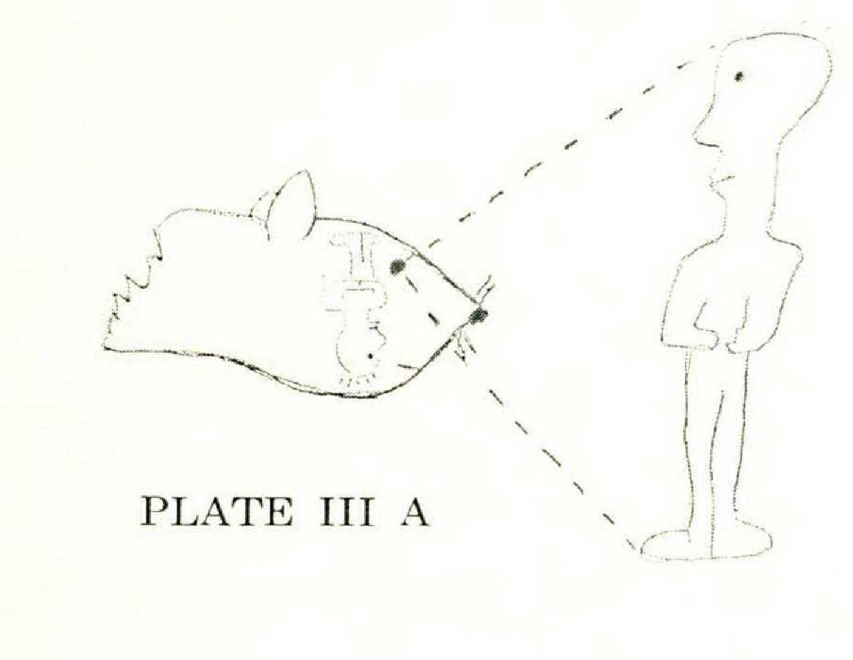 In PLATE II A, a bear is shown seeing a man. Here again inversion of the optical image has, unfortunately, occurred. However, PLATE III B suggests two possible expedients. The bears in the plate are both looking at a tree sloth, which, of course, normally resides upside down. The upper bear is wearing corrective lenses so that his image of the sloth is inverted once by the lenses and then reinverted in his head. As a result he “sees” the sloth as it usually appears in nature.