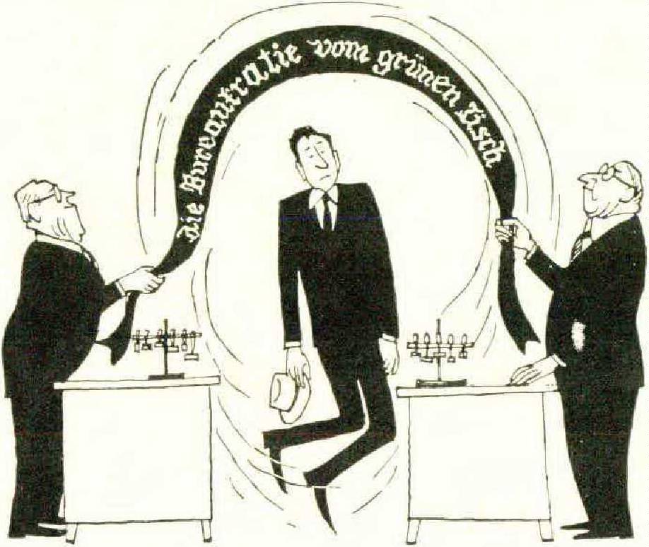 I evolved a theory that German libraries and banks are both plugged into a Platonic heaven of pure organizational form — the Geist is unmistakably the same. After we got our nameplate working, we joined a nice friendly neighborhood bank. I could tell because it had a luxuriant Christmas tree way back in October. Now, take a simple operation like withdrawing some of your own, personally deposited money.