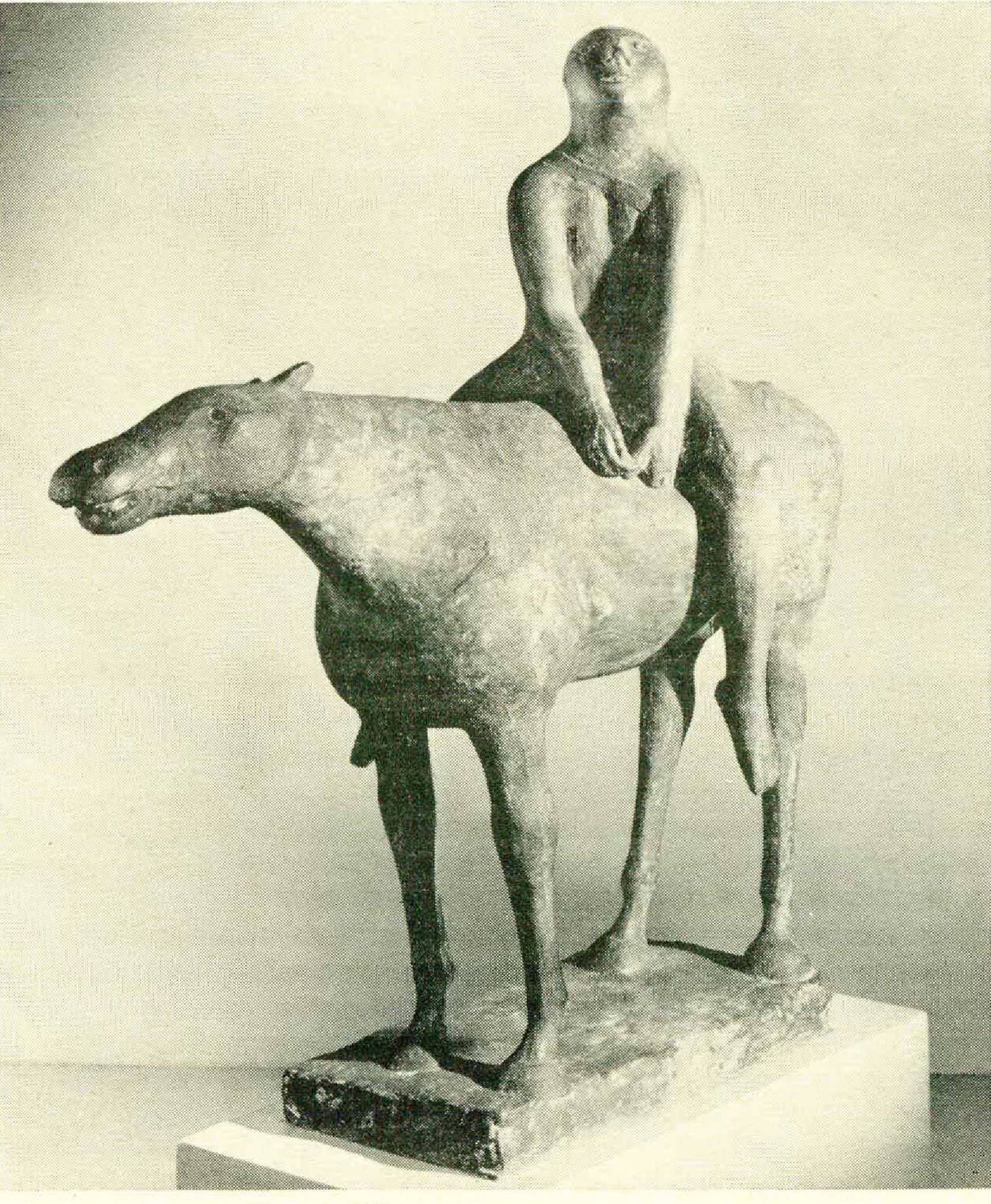 Other artists of this post-war period have been engrossed by one image which haunted and obsessed their mind. The Italian sculptor Marino Marini has become famous for his many variations on a motif that impressed itself on his mind during the war — the sight of stocky Italian peasants fleeing from their villages on farm horses during air raids. It is the contrast between these anxious creatures and the traditional image of the heroic horseman that lends a special pathos to these works.