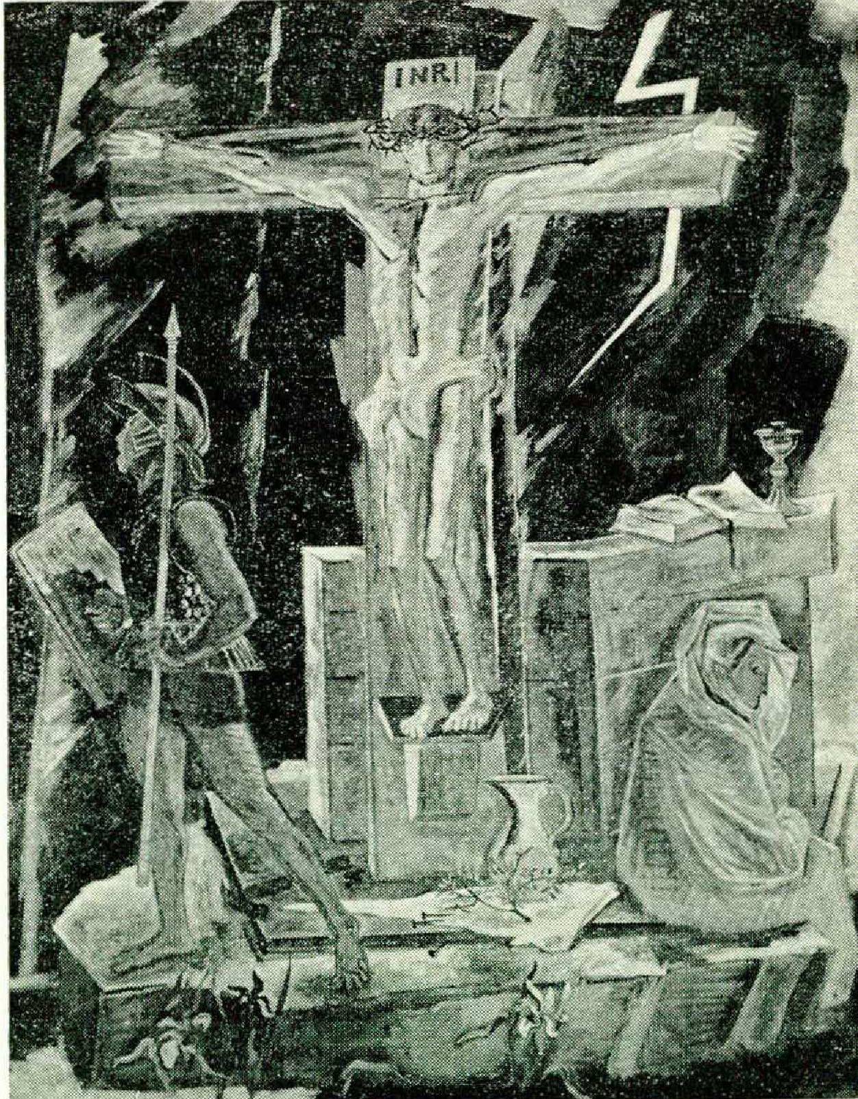 The great, sad, enigmatic Crucifixion, which closed the survey of his work in the retrospective exhibition of 1964, now hangs on one wall in the library, it is not an easy picture or an ordinary Crucifixion. On one side of the cross is a violent, roaring warrior, bellowing at the unseen world outside the frame. On the other side a hooded, brooding figure sits with one eye glowering at the observer, as if to say, “This is a hell of a way to run a world.” The Corpus is like a huge painted wooden doll carved by a primitive and not very skillful carver. The nails have been drawn and lie on a white paper below; therefore the body has been taken down, once. An open book and a chalice and paten speak of the passage of time and the history of the Church for two thousand years. Yet the desiccated body is once again standing on its cross, fresh blood showing in its wounds. In the foreground, a green branch and blooming flowers speak of the loveliness of life ever renewing itself. I thought of Phillips Brooks, and of that stormy and unecclesiastical picture.