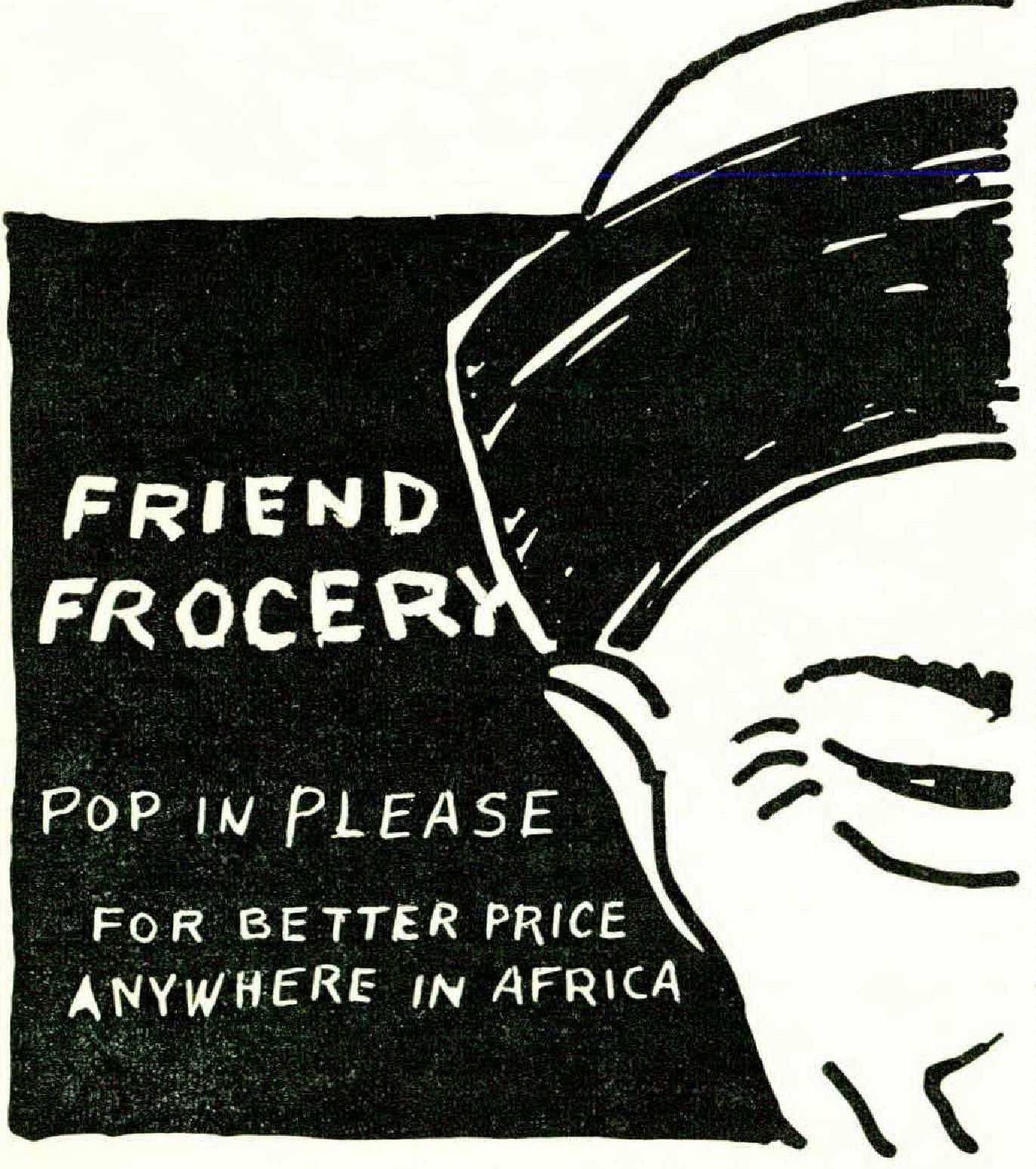 Two days before the store opened, Soo stayed in and busied herself with white paint and a large board. At the end of the day she showed Fong the sign: “Friend Frocery Pop in Please for Better Price Anywhere in Africa.” She smiled, “This is your sign. This is your store, noble husband. You are now a grocer man,” she said in Chinese. Instead of being pleased, Sam Fong felt only fear, and for her sign and her words Soo Fong was so severely beaten that she was unable to attend the Grand Opening.