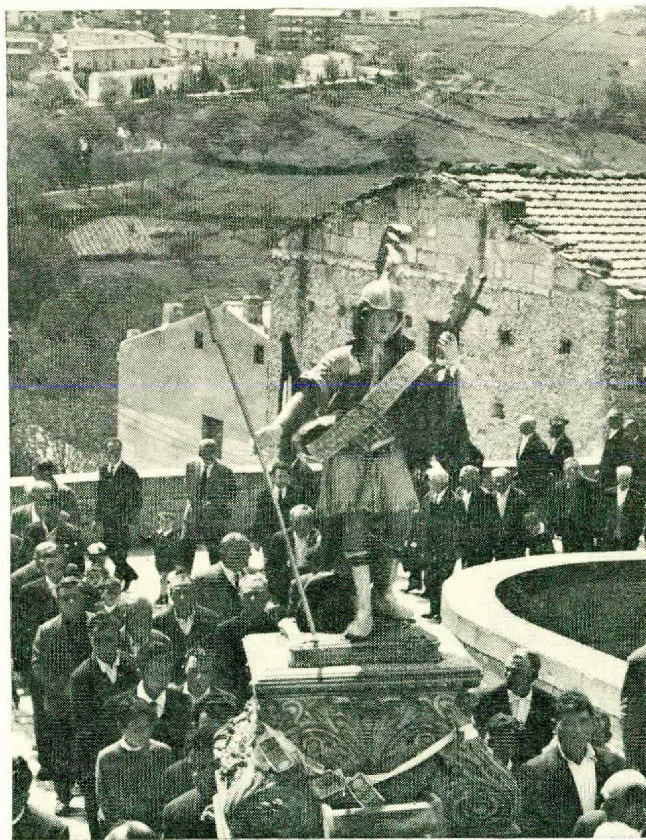Next morning Santa Filomena led the procession, borne aloft, reclining like a china Elizabeth Barrett Browning on a gold baroque chaise longue with satin pillows and angels that hobbled at the ends of long springs. She was languid and either very frail or very haughty. Her herald was an old shepherd who tootled away on his bagpipes; her followers, the women of the town, who were more dejected than elated by their lover’s pursuit. They groaned an anthem whose words were lost in a babble of conflicting versions. Way at the back came San Pancrazio, a medieval beatnik scrubbed up and dressed for the occasion in tin armor and a satin miniskirt. With each lurch his puttees rattled and his helmet swiveled around on his wig. His bearers were doing their best, but they had to follow the excited directions of a priest carrying a wax hand mounted on a golden column. When he raised the hand high in the air, they stopped and wobbled. Two waves and they staggered off. The pace was so slow there at the back that the men who followed San Pancrazio had time for a glass of wine at the several shops along the route. Soon their faces were flushed and their steps uncertain.