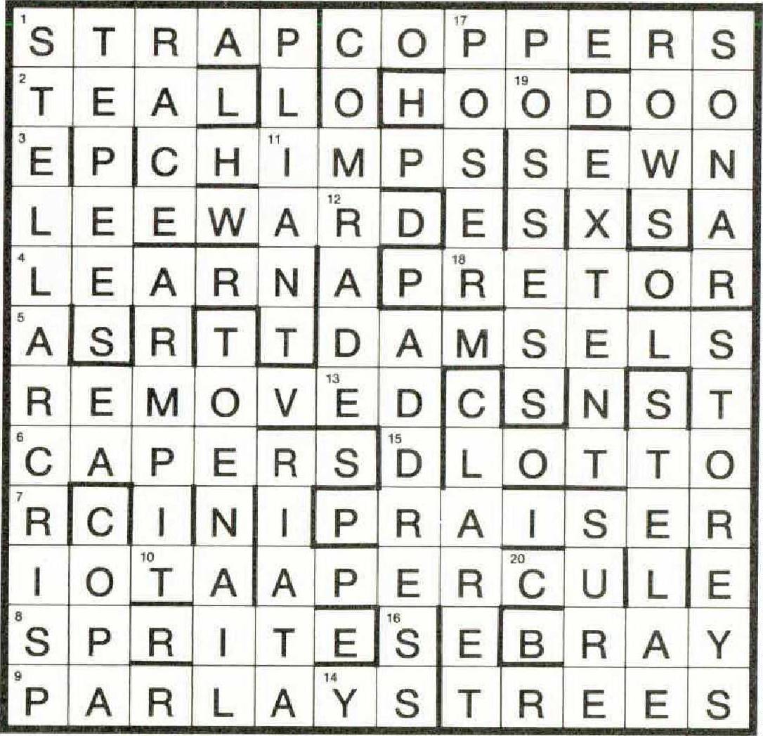 Across. 1. P-RAISER 2. T-REES (seer rev.) 3. CH-IMPS 4. CAPERS (anag.) 5. SPRIT-E (anag. + e) 6. TEAL (anag.) 7. IOTA (hidden) 8. APER-CU(t) 9. LEAR-N 10. LOT-TO(o) 11. REMOVED (anag.) 12. LEE-WARD 13. SEWN (anag.) 14. PRETOR (anag.) 15. B-RAY 16. ST-RAP 17. COPPERS (double def.) 18. P(AR)LAYS 19. HOOD-OO 20. DAMSELS (anag.) Down. 1. STEL(L)AR (anag. + l) 2. TEP-EES (rev.) 3. RACE (double def.) 4. PL(I)ANT 5. CO(MRA)DE (arm rev.) 6. POSER (double def.) 7. POSSE’S-S 8. ROWS (double def.) 9. SONAR (hidden) 10. EX-TENT 11. ARMPI-T (anag. + t) 12. T(OEN)AIL (one anag.) 13. ADDRESS (double def.) 14. STORE(Y)S 15. C(L)ARET (anag. + l) 16. STELAE (anag.) 17. C-RISP (anag. + c) 18. R(I)AT-A (a tar rev.) 19. COP-A 20. SURE (anag.)