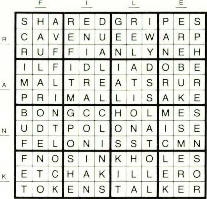 Each of ten clues (listed a j in no special order) yields a tenletter word chat may be split in half to form two five-letter words. The 20 five-letter words formed in this way belong in the diagram; solvers may locate them with the help of Across and Down words, which are treated normally. Final diagram entries include seven proper nouns; 21 Down is an archaic variant.