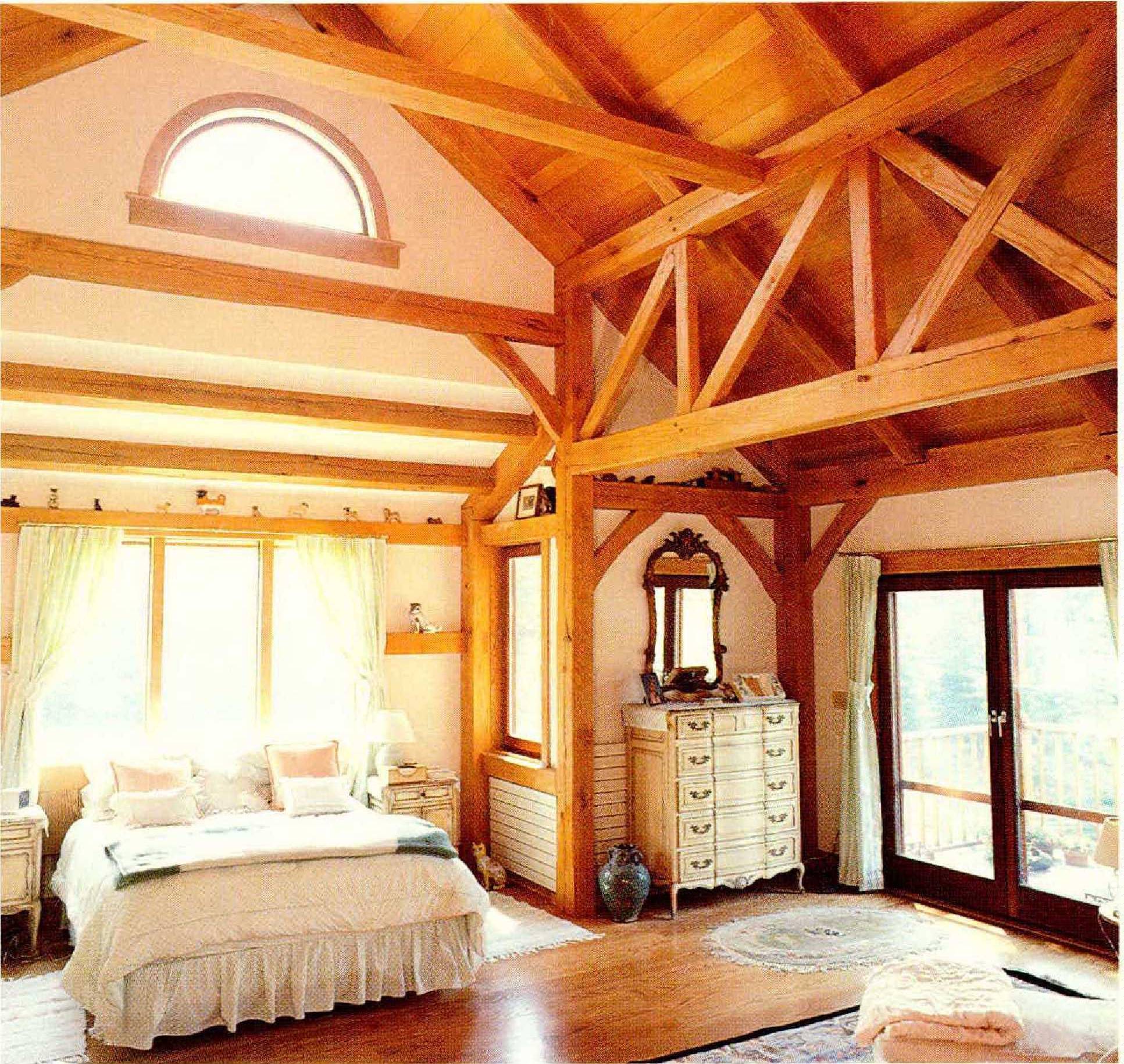 Much the same effect is achieved in the master bedroom, through another combination of framing. Oak beams extend across the sloping ceiling above the bed, breaking the expanse of gypsumboard into segments. Along two walls of the bedroom, bridge trusses—a combination of Xs and diagonal timbers like those in covered bridges—prevent the large room, which has a sitting area and a TV set at one end, from seeming to be a single, overly vast volume. I emphasize timber framing’s success in bringing human scale to large, tall interiors because this is one of the major unresolved problems in many of today’s “move-up” houses and even in some retirement houses, such as those I’ve seen in Sun City West, Arizona.