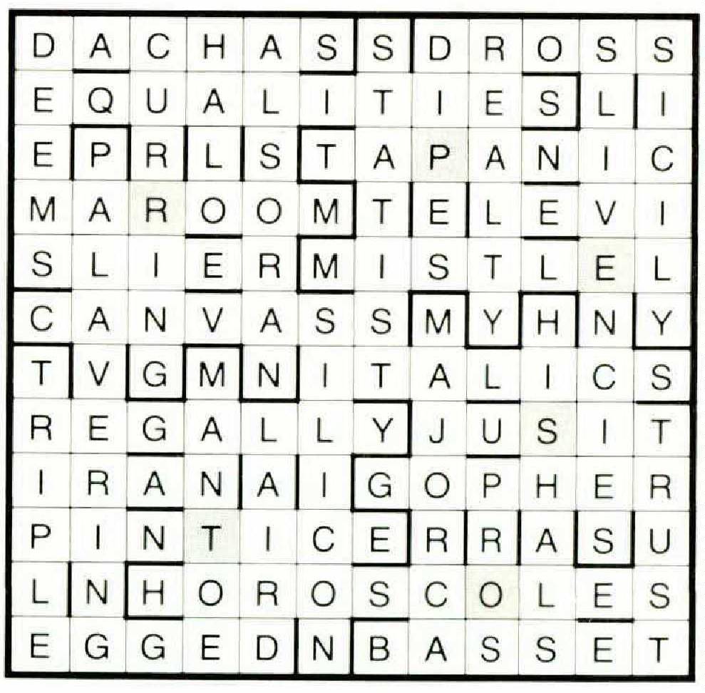 The trapdoor word is PRESTO. Across. 1. DAC-HAS (cad rev.) 6. D-ROSS 10. E-QUALITIES 12. TA(PR0-0)M 13. MARS-HALS 14. LE(V)I 15. SLIER (hidden) 16. MISTLE-TOE (homophone) 17.CANVAS-S 23. ITALICS (anag.) 24. RE(GAL)L.V 26. JU(ST)ICE 28. I-RAN 29. GOP-HER 31. PIN-TO-S 32. HOROSCOPES (anag.) 33. EGGED (double def.) 34. B(ASS)ET Down. l.DE(E)MS 2. CLRR(ENC)IES 3. HAL-O 4. ALSO-RAN (hidden) 5. S(TATI)ST (at it anag.) 6. DIP-OLES 7. REALTY (anag.) 8. S(LIYER)I\G 9. SICILY 11. PAL(AVER)ING 18. SIL-ICON (LI’s rev.) 19. MAJ-ORCA (jam rev.) 20. HLS-PANIC 21.TRIP(L)E 22. MANTEL (homophone) 25. LAIDRD 27.T-RUST 30. PRO-SIT