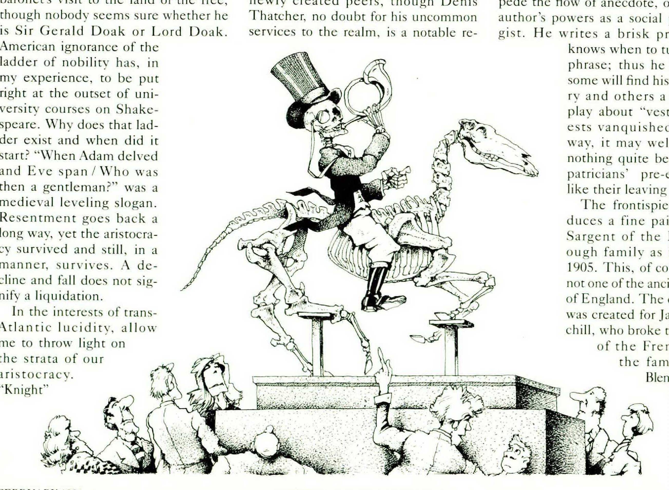 AMERICANS, BEING good republicans and democrats, should either have no interest in Professor Cannadine’s subject or else take a grim pleasure in his record of the decay of privilege. Yet there remains a certain nostalgia, at least for titles, else why call Ellington Duke and Hines Earl? In Sinclair Lewis’s Babbitt the eponym is proud of taking a decayed baronet to a Chicago cinema. The Zenith gossip columnist fulsomely celebrates the baronet’s visit to the land of the free, though nobody seems sure whether he is Sir Gerald Doak or Lord Doak. American ignorance of the ladder of nobility has, in my experience, to be put right at the outset of university courses on Shakespeare. Why does that ladder exist and when did it start? “When Adam delved and Eve span / Who was then a gentleman?” was a medieval leveling slogan. Resentment goes back a long way, yet the aristocracy survived and still, in a manner, survives. A decline and fall does not signify a liquidation.