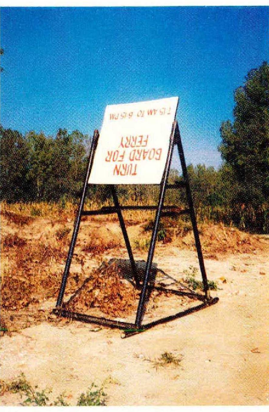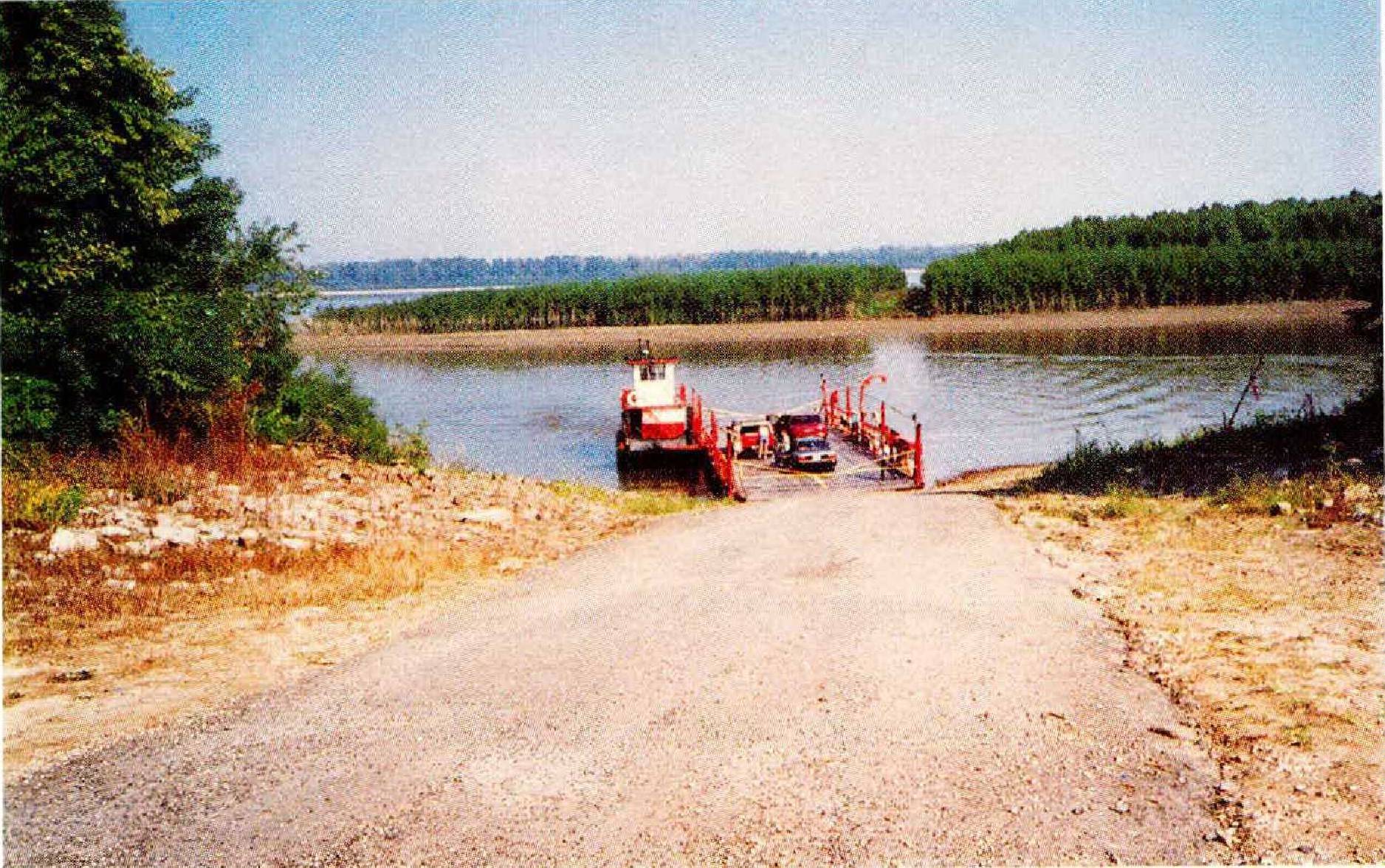 I found the ferry landing before I saw much evidence of Dorena. It was a steep, sandy, open place. I could see the ferry in the river, making its way to Kentucky. Like the old Tiptonville ferry, it consisted of a small towboat with a small barge attached to it. It was painted red and white, and looked nice against the brownish-blue of the water. The Hickman landing was mostly hidden behind a long, narrow bar covered with short trees. Someone had cut a swath through the trees on the line of sight between the two landings. On my side was a sign that said TURN BOARD FOR FERRY, so I turned it and sat on the hood of my car to wait. If I squinted, I could just make out a tiny black square on the Kentucky bank— the back of the other signal board.