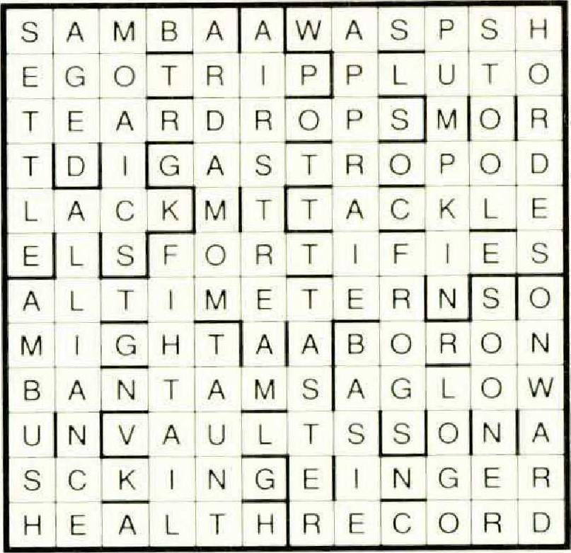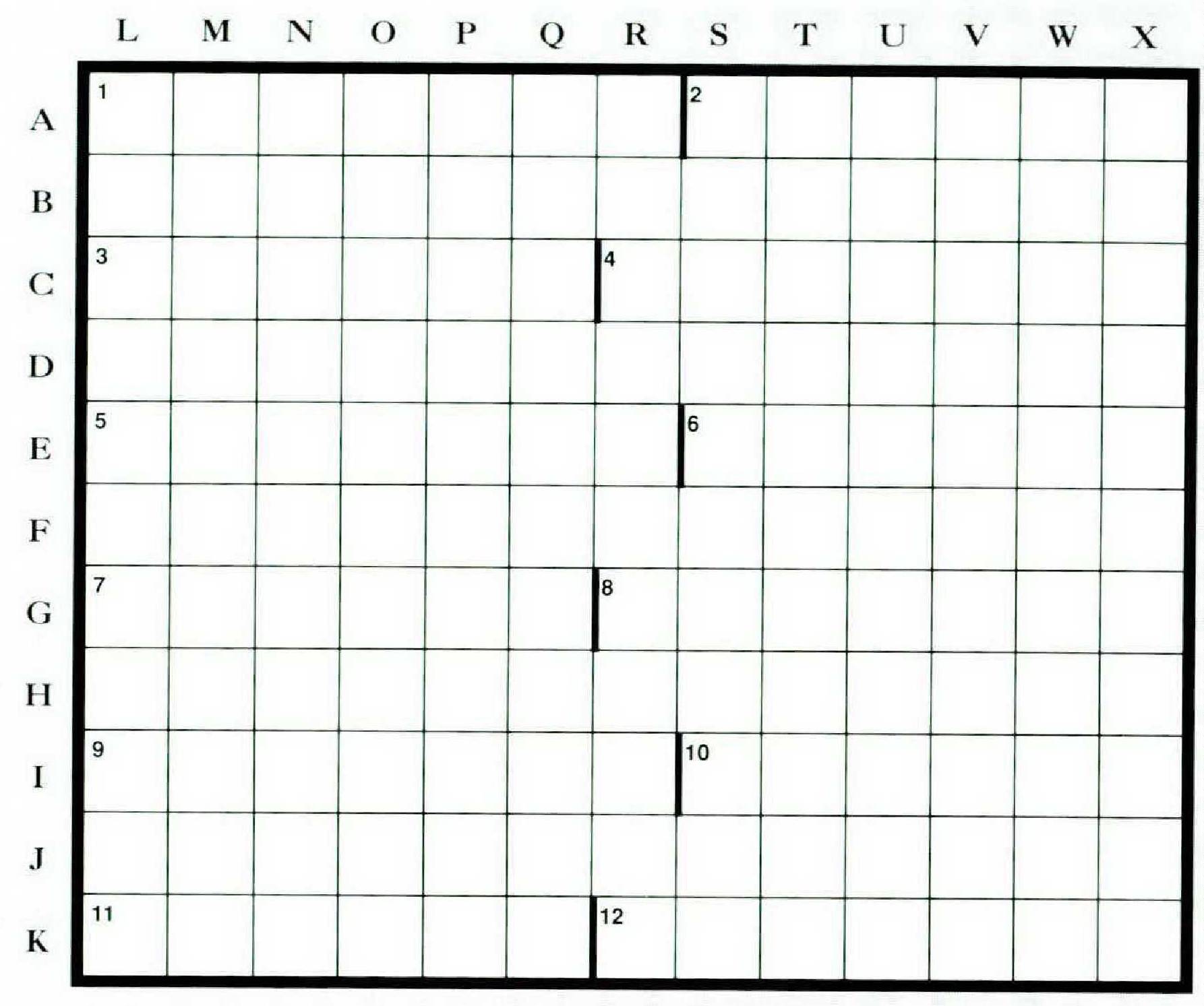 Across answers 1-12 are entered in the diagram normally. The 26 Knight’s Move answers are accompanied by coordinates indicating their beginning and ending squares (AL, for example, being the upper left corner), and they are entered in the diagram in L-shaped jumps, the way a chessboard knight moves: each letter after the first jumps two squares in one direction before landing in a third square to one side. When the diagram is completed, the central Across row will reveal a two-word phrase suggesting the activity of knights. Answers include three proper nouns.