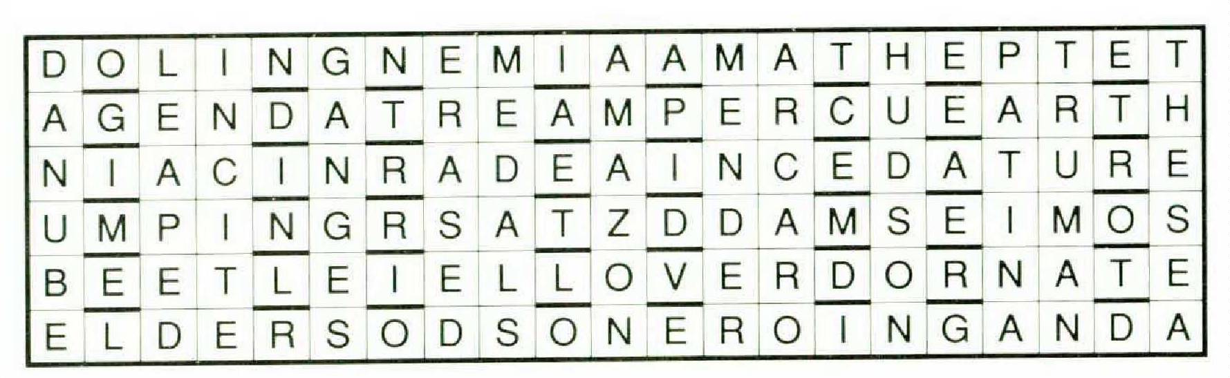 Runners. 1 .a. VPKRiOl b. DO(LIN[E])G C. UGAN-DA (agun anag.) d. GRAI)K A (gray day homophone) 2.a. sKR-T)K I b. (s)AD-DAMS c. AG(HND)A d. tanz)AN(EMHA (me rev.) 4.a. MHI,1.0 (anag.) b. OR-NATE (neat anag.) e. NIA(C-I)N (Nina anag.) d. OVK(R)DO (dove anag.) 4.a. LMPIN)G (gum anag.) h. HKAR)T-H c. Godnxst-nN d. NA-MATH 5.a. KRSVI-Z (anag. + Z) b. UKiKTDK (let anag.) c. v\-’n RK (true anag.) d. XKRO (I)N’