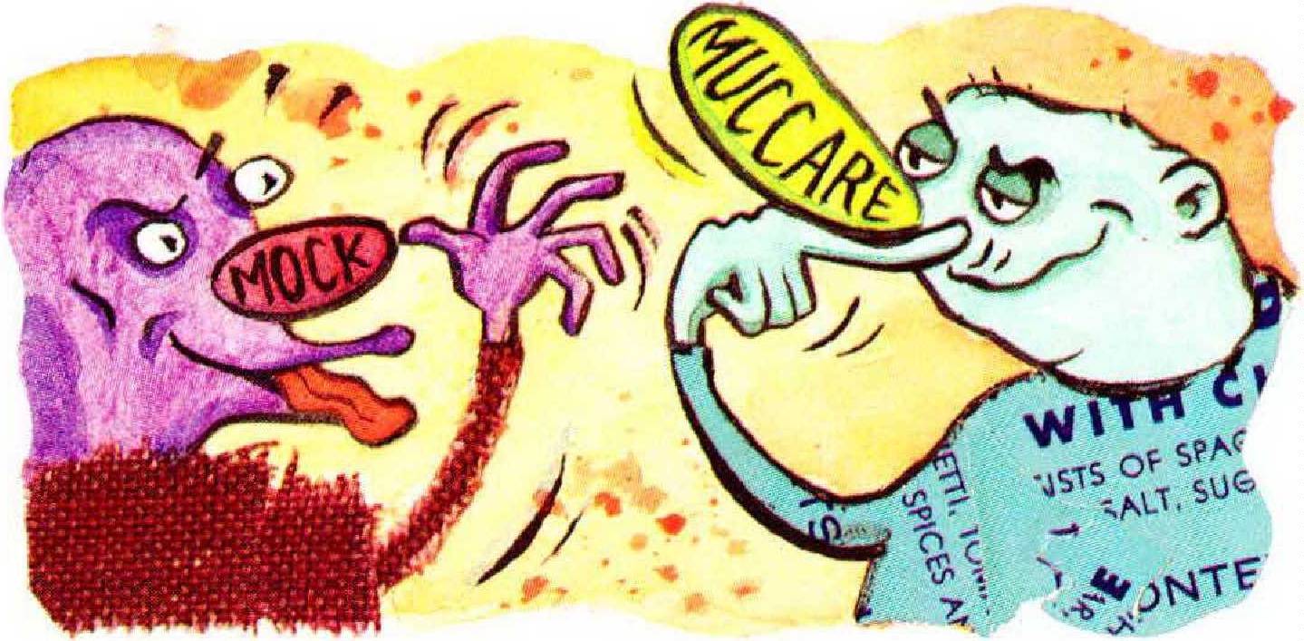 Tensions between the military and President Bill Clinton surfaced on a visit paid by Clinton to the U.S.S. Theodore Roosevelt last spring. One reporter later recalled the visit in a remark to the President: “Sailors . . . were mocking you . . . even though you are the Commander in Chief.” The origins of mock (to ridicule, deride) are uncertain. The word may be from the dialect German mucken, “to growl, grumble.” The famous word chronicler Eric Partridge has proposed that mock originates in Momos, the Greek god of ridicule, who criticized virtually everything. Most authorities, however, believe that the word comes instead from the Latin mucus, “mucus,” and its colloquial derivative *muc-care, “to wipe the nose.” This became mocquer in medieval France, where—perhaps not Surprisingly—the verb acquired the sense of wiping or thumbing one’s nose as a gesture of contempt and ridicule. (The reflexive verb form of “to ridicule” in Modern French is a vestige of the nose-wiping idea: se moquer de quelqu’un literally means “to wipe one’s nose at someone.”) The word was quickly appropriated by the English and spelled moke or mock (“Have the non other man to moke, but ever me?”—Mankind, 1450). Because to mock a thing is often to parody or imitate it, the word later also came to mean “imitation,” as in mock turtle, “a dish consisting of calf’s head dressed with sauces and condiments so as to resemble turtle.”