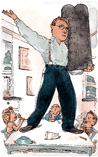 O my children, you are disobedient. For when I tell you what you must do, you argue and dispute hotly even to the littlest detail; and when I do not accede, you cry out, and hit and kick. Yes, and even sometimes do you spit, and shout "stupid-head" and other blasphemies, and hit and kick the wall and the molding thereof when you are sent to the corner. And though the law teaches that no one shall be sent to the corner for more minutes than he has years of age, yet I would leave you there all day, so mighty am I in anger. But upon being sent to the corner you ask straightaway, "Can I come out?" and I reply, "No, you may not come out." And again you ask, and again I give the same reply. But when you ask again a third time, then you may come out.