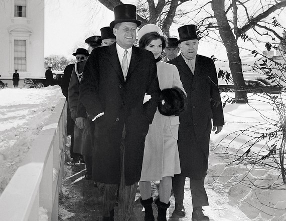 Having donned a topcoat and hat, President Kennedy strolls with the first lady outside their new residence on their way to watch the inaugural parade. (John F. Kennedy Presidential Library and Museum)