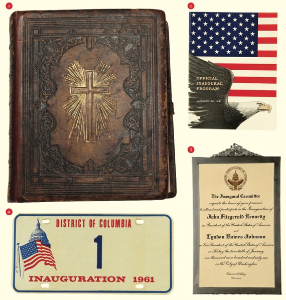 1. To take the oath of office, the incoming president lays his hand on his mother’s 1850 family Bible, which records the 1914 marriage of Rose E. Fitzgerald and Joseph P. Kennedy and the births of their nine children. 2. The official program of the January 20, 1961, inauguration. 3. Attendance re- quired a printed invitation, signed by inauguration chairman Edward H. Foley. 4. A forerunner of vanity license plates, for the presidential limousine. (John F. Kennedy Presidential Library and Museum)
