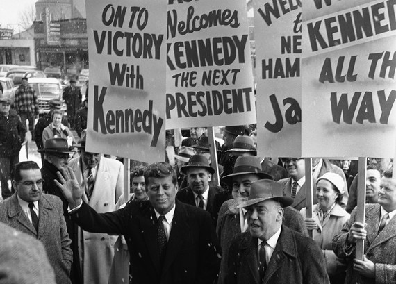 Kennedy campaigns in Nashua, New Hampshire, on the Massachusetts border, in January 1960. His only opponent in the state's March 8 presidential primary was the inventor of a space-age ballpoint pen. (John F. Kennedy Presidential Library and Museum)